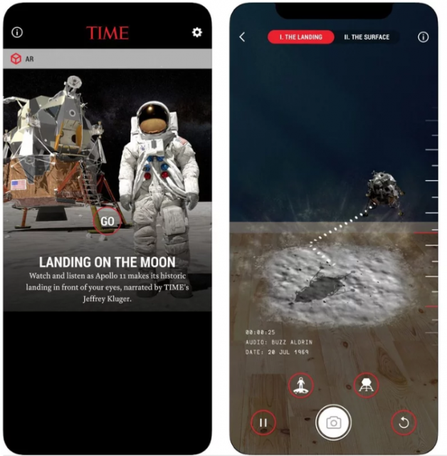 VR / AR 技術除了運用在娛樂、醫療、教育服務外,現在也能運用在新聞傳播上。根據 VR 陀螺的報導,時代雜誌在 7/19 推出一款結合 VR / AR 的應用程式《TIME Immersive》,該應用程式支援 iOS 和 Android 手機。該 APP 第一篇新聞報導《登陸月球》,觀眾可以在家中的桌面,透過 3D 圖像,體驗阿波羅 11 號登陸月球的情節。未來時代雜誌將會不斷更新 AR 和 VR 新聞。