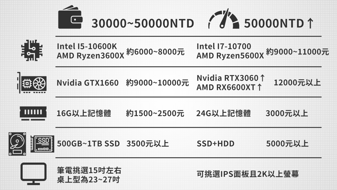 而如果你今天預算蠻充裕,也希望能買一台陪自己比較久的電腦的話,那你可以考慮 CPU 直接上到 Intel 的 i7-10700 或是 AMD 的 Ryzen-3700X,同時在給他搭配個 RTX3080 或是 RX6800XT 的顯卡,記憶體則可以考慮升到 24 或 32G,至於硬碟呢除了 SSD 以外還可以再加裝一顆 HDD,如果說你擔心因為用的時間比較久導致資料量多的話,那也可以再買一顆行動硬碟也沒關係,至於螢幕的部分,我們強烈推薦可以考慮雙螢幕的配置,即便你是用筆電也可以再買個螢幕外接,保證對於你工作效率的提升是馬上就有感的!