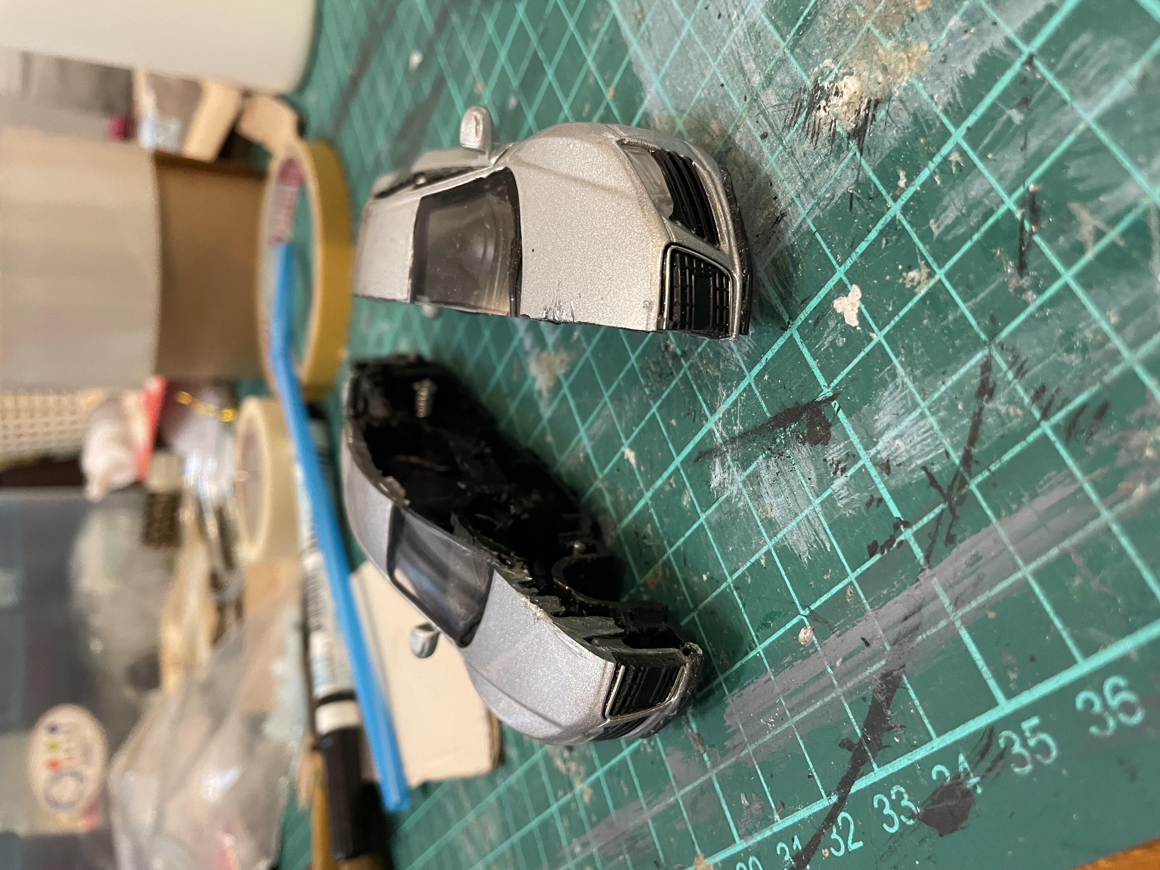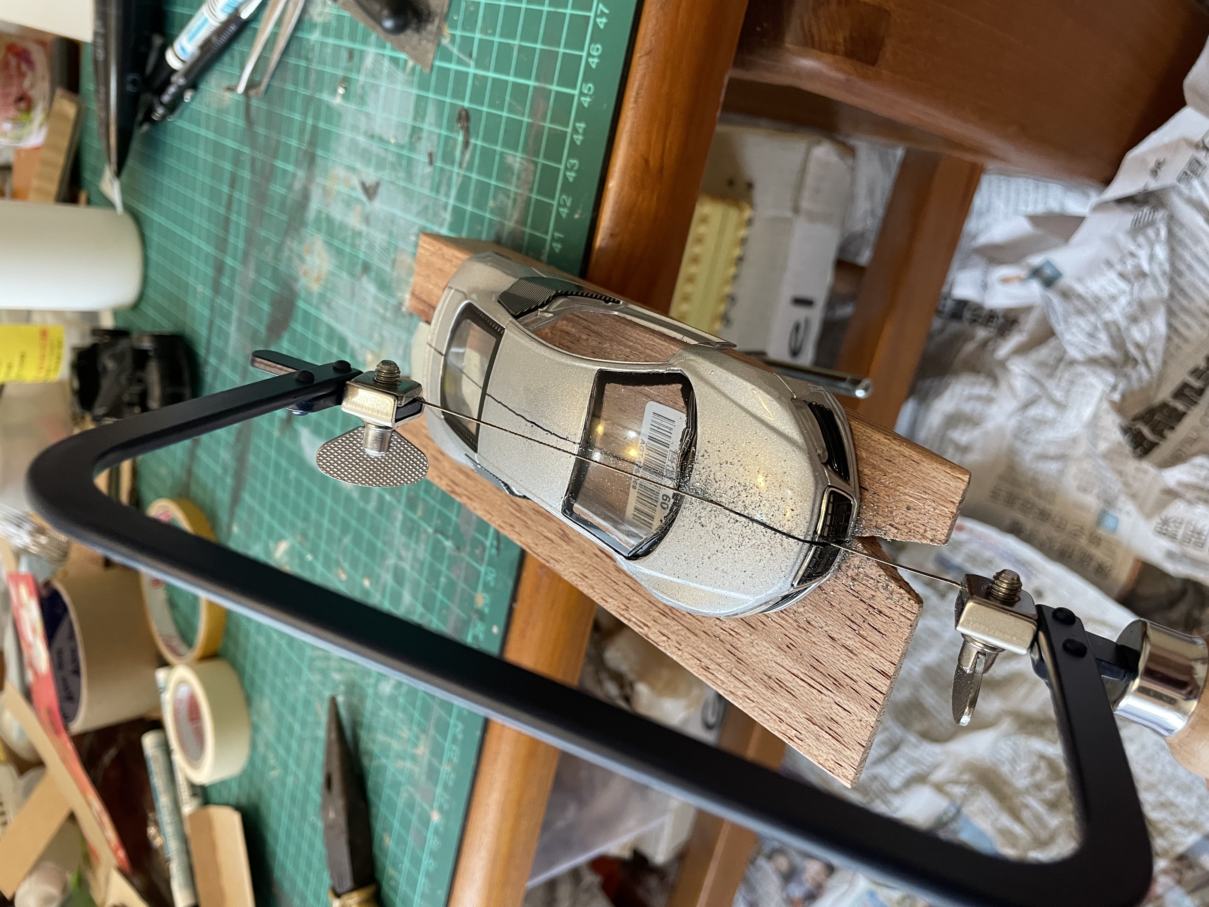 然而,如何精準切開合金車體成了新的難題;他帶著模型奔走於金工店與木材行,卻分別因店內「只製作首飾」以及「大型切割機可能震碎車窗」等理由而遭到婉拒 。最後,他在金工工具店員的指導下買回專業線鋸,耐著性子將模型車的車殼、內裝與底盤逐一拆解,再手工慢慢鋸開後裝回,並且確保模型即便被切開仍能維持結構的完整性 。