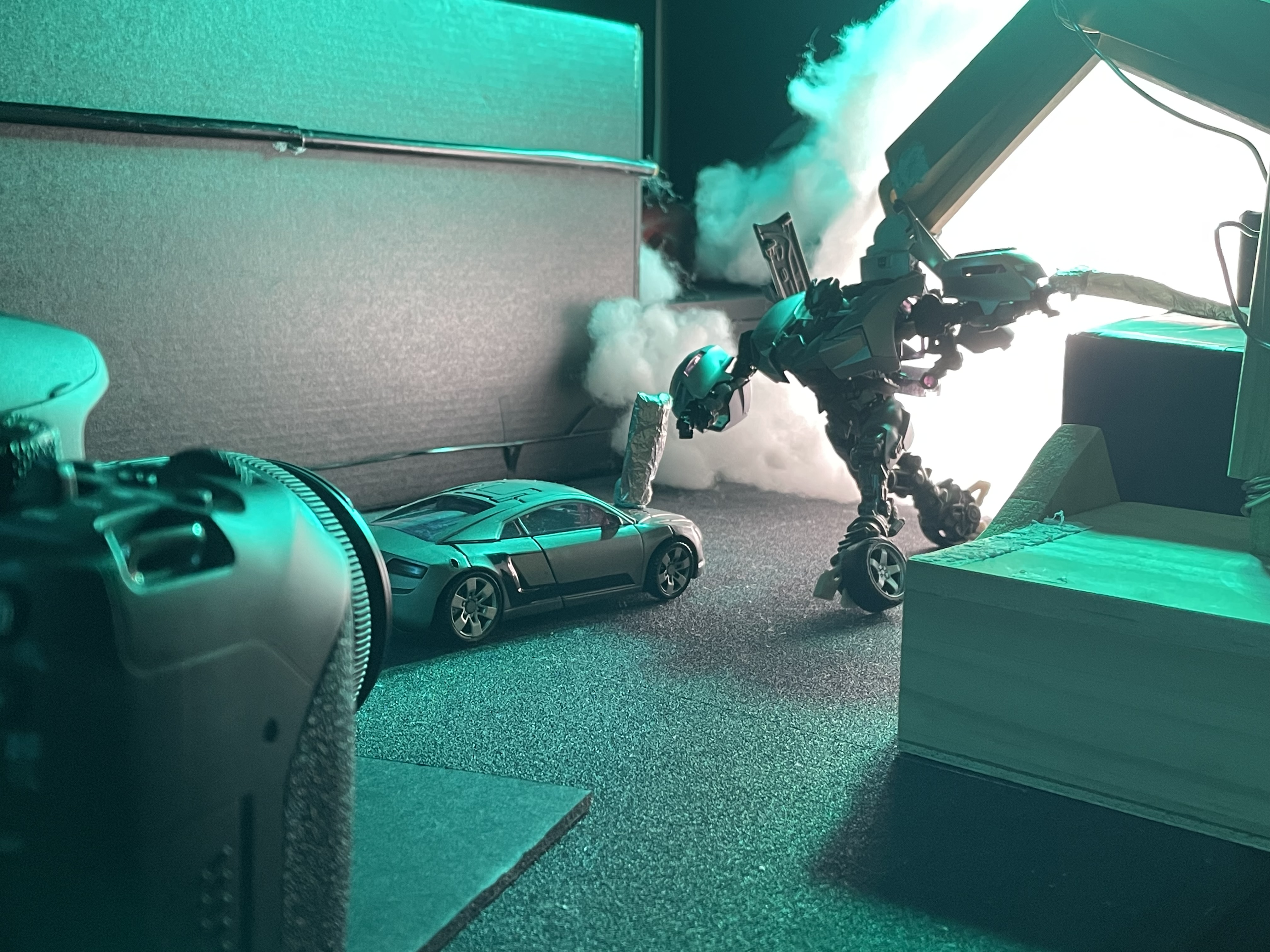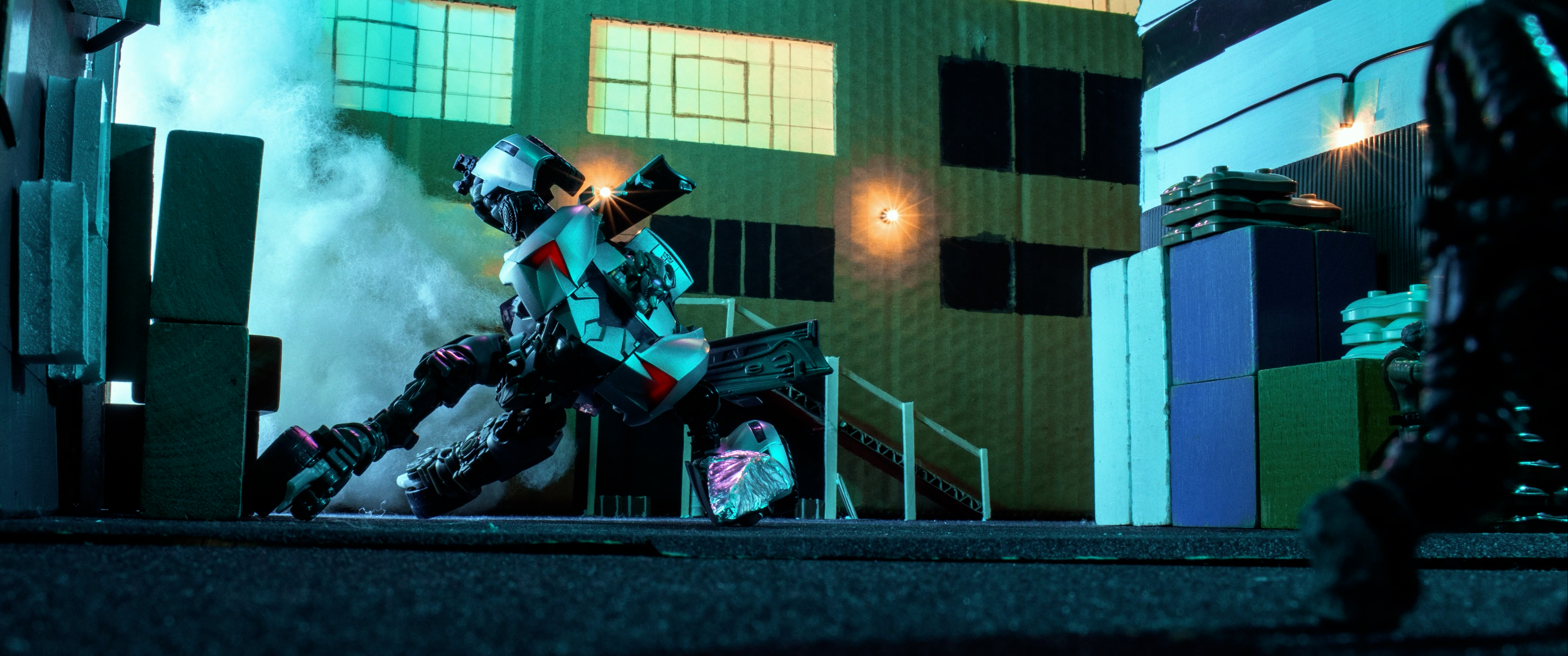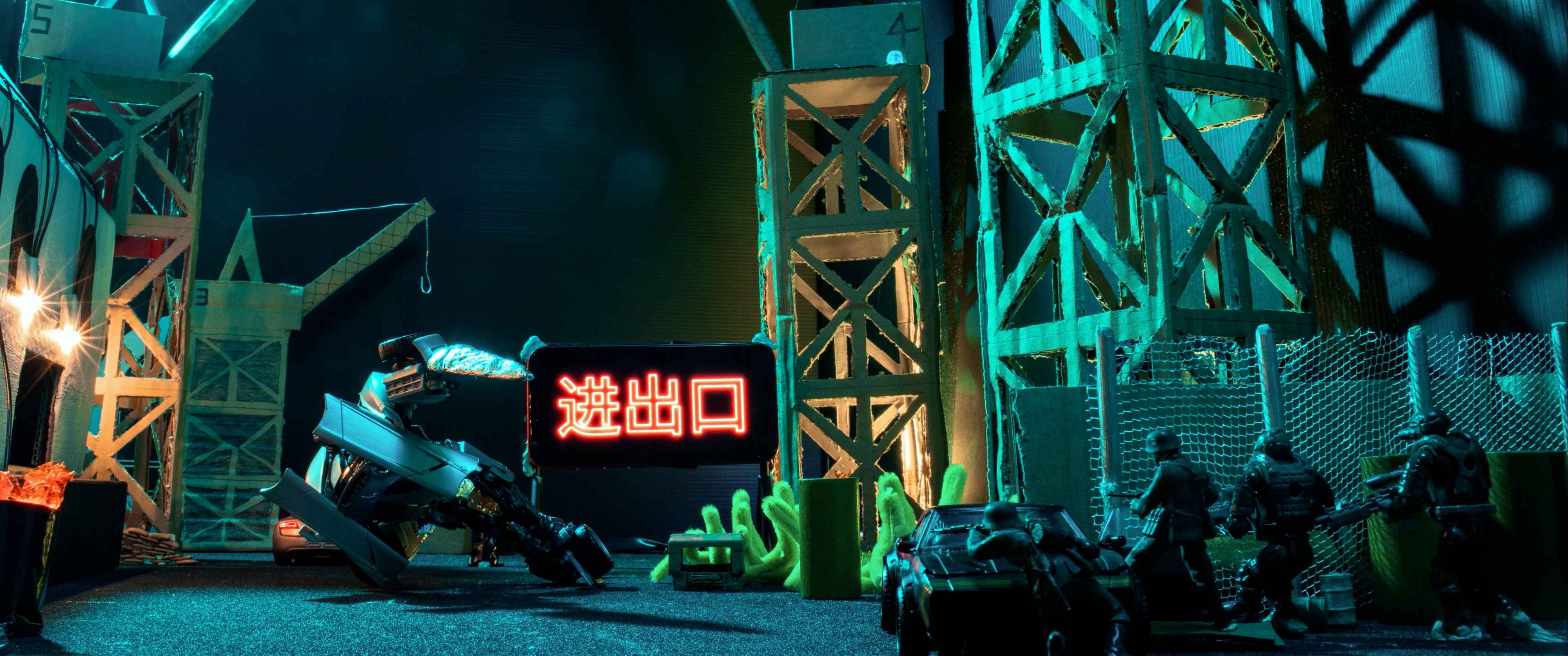 在光學表現上,他極具創意地將手機或平板螢幕直接藏在微縮景觀中發光,完美模擬出城市的霓虹燈特效。針對射擊鏡頭,他堅持在拍攝影格當下用手電筒在玩具模型上打出真實光束,再於後製階段疊加數位槍口閃光(Muzzle Flash),藉由實體光影與數位的結合,增加畫面的視覺層次與重量感。