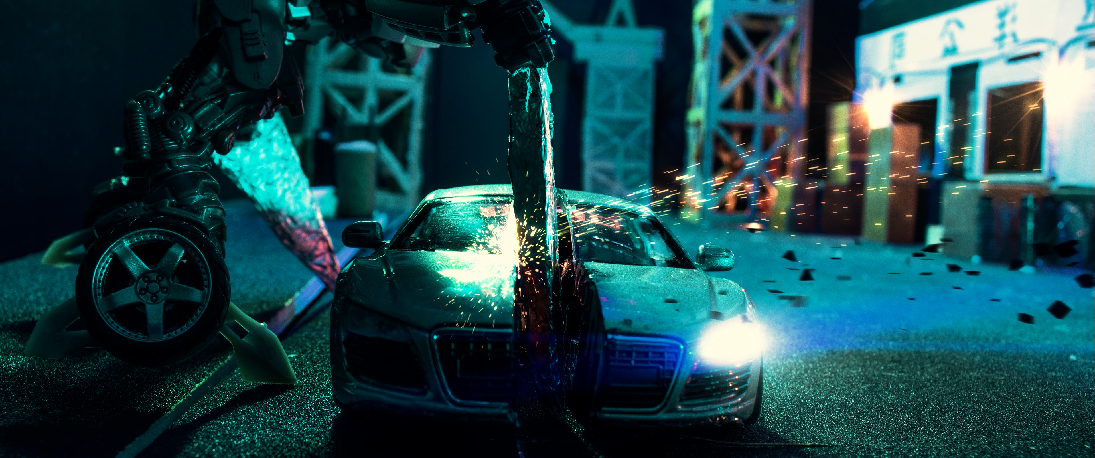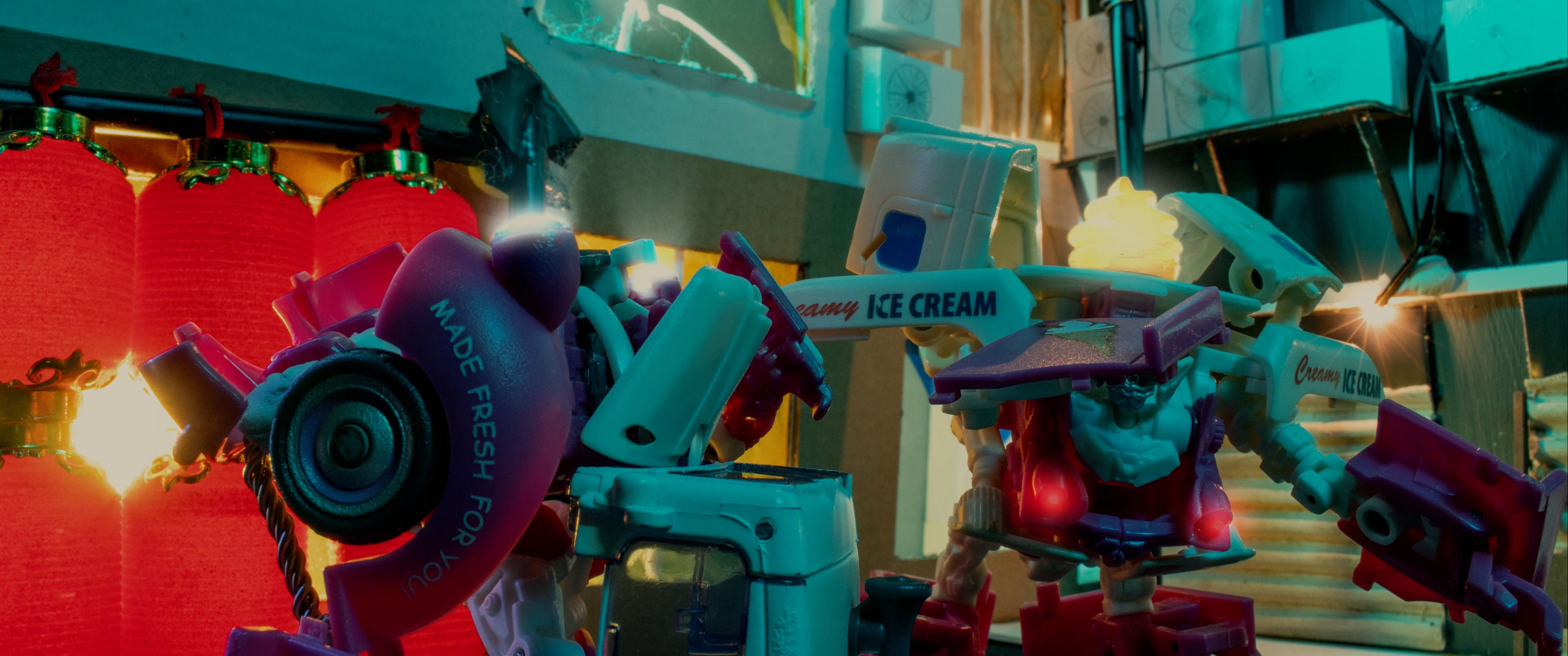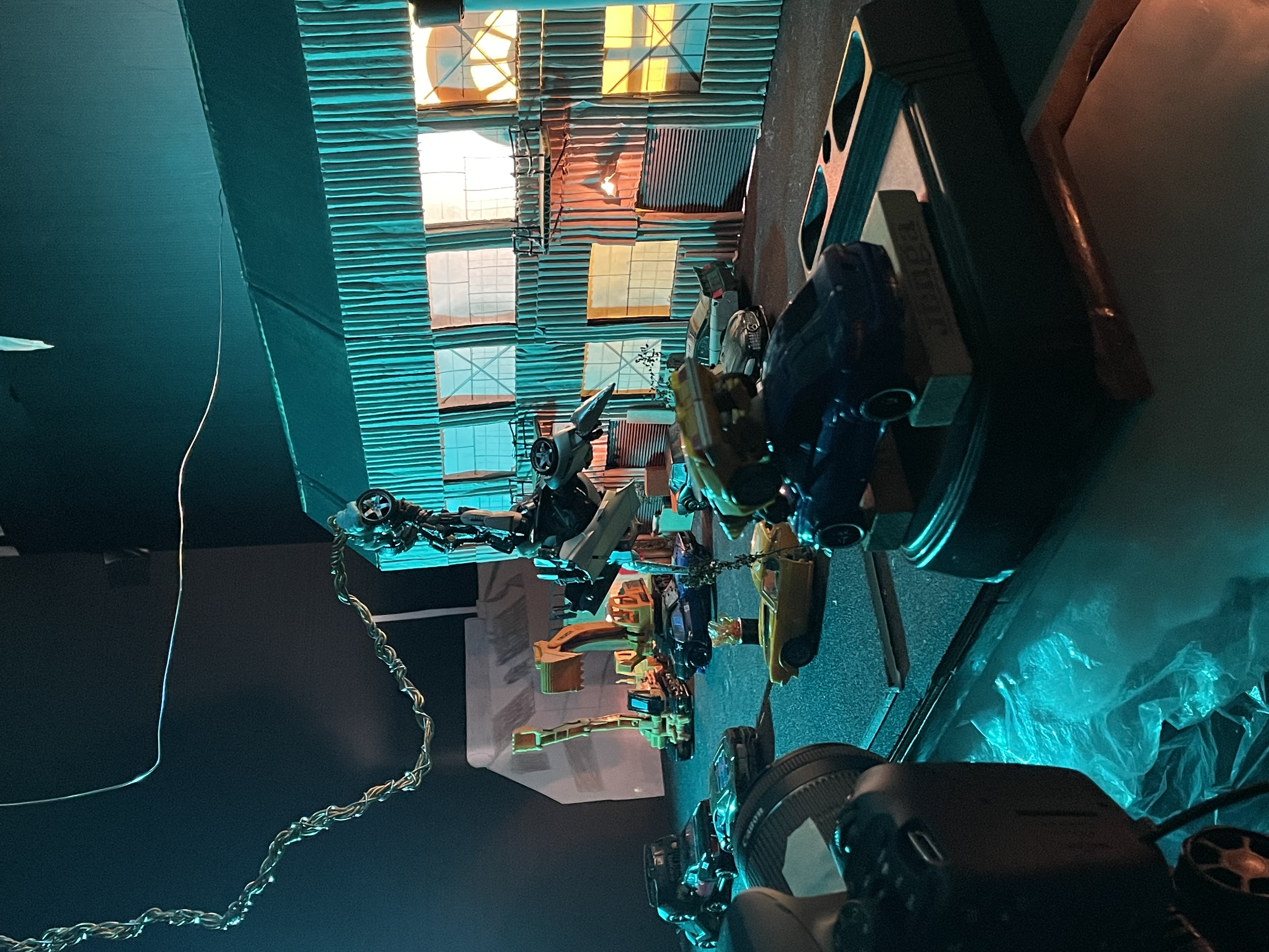 在光學表現上,他極具創意地將手機或平板螢幕直接藏在微縮景觀中發光,完美模擬出城市的霓虹燈特效。針對射擊鏡頭,他堅持在拍攝影格當下用手電筒在玩具模型上打出真實光束,再於後製階段疊加數位槍口閃光(Muzzle Flash),藉由實體光影與數位的結合,增加畫面的視覺層次與重量感。