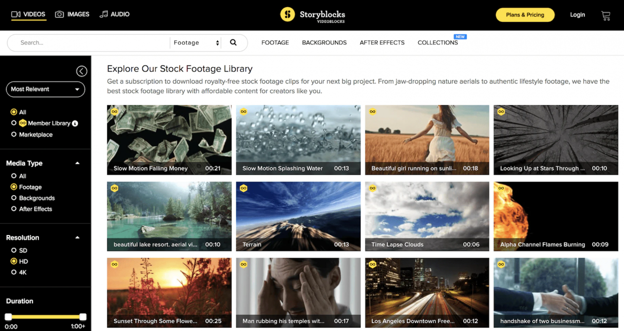 Storyblocks 是上述提及的 Dareful 創建者 Joel Holland ,擁有的另一個素材資源網站,其特色為提供超大量的精美影片素材,並按月付費使用。Storyblocks 的使用介面非常鮮明直覺,除了擁有特殊片段、背景及後製效果的素材外,Storyblocks 還提供大量的空拍鏡頭、縮時攝影及不同環境和情況的素材,整體品質都非常高且專業。若想從網站上下載素材,使用者必須遵從 Storyblocks 的付款方式:每月付費 15 美金,即可於當月下載五個素材;每月付費 30 美金,即可無限次數下載所有素材。