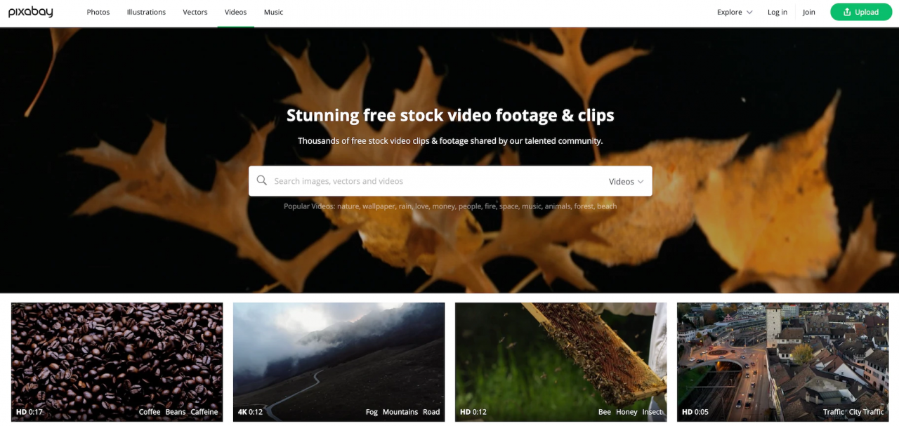 Pixabay 擁有超過 270 萬種免版稅影片及圖片素材,主要由其他創作者提供,且基本上不會有版權的問題,完全任使用者自行挑選使用。能有這種好康主因於 Pixabay 的所有影片素材都是在 CC0(公眾領域貢獻宣告,Creative Commons Zero)上發布的,這意味著使用者不需獲得原創作者的允許即可進行剪輯,甚至也不必註名。Pixabay 大量的精選影片素材都是以 MP4 檔為主,長度通常都在一分內,且使用者還能選擇要下載何種畫質,以便在商業與非商業用途之間做取捨。總結來說,Pixabay 提供的影片素材範疇非常廣,包括自然生態、外太空,或是一些特定環境等等,可以說是一應俱全。