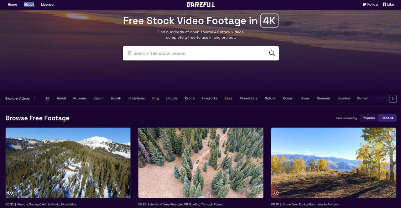 Dareful(以前叫 Stock Footage 4 Free)是一個擁有優質且免費的 4K 高畫質影片素材網站,使用者可以隨心所欲地使用相關資源。跟上述的 Splitshire 一樣,網站上的所有素材均由 Joel Holland 一人獨自拍攝,而他同時也是另一個圖像及影片素材平台 Storyblocks 的創建者。因他更重視品質而非數量,所以網站中的素材都有極高的畫質,且搜尋欄及分類讓使用者能輕鬆找到理想的素材,包括空拍、煙火、高山、湖泊、海灘及夏天等豐富主題。使用者需創辦一個 Dareful 帳號才能下載素材,並在使用素材時提供出處,因為網站的素材資源都是由 CC4.0(創用 CC 授權條款,Creative Commons license)提供的。