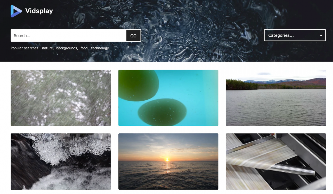 Vidsplay 也是一個擁有大量免費影片素材的資源網站,每週都會新增素材,且所有素材均可免費用於個人或商業用途,但 Vidsplay 會要求使用者「必須將導向 Visplay.com 的連結,作為個人網站或是影片的結尾」。網站上大部分的影片素材都是 MP4 格式,使用者可在預覽視窗上查看每個素材的畫質、幀數及時間長度等等,且無需創建帳號即可下載所有素材。
