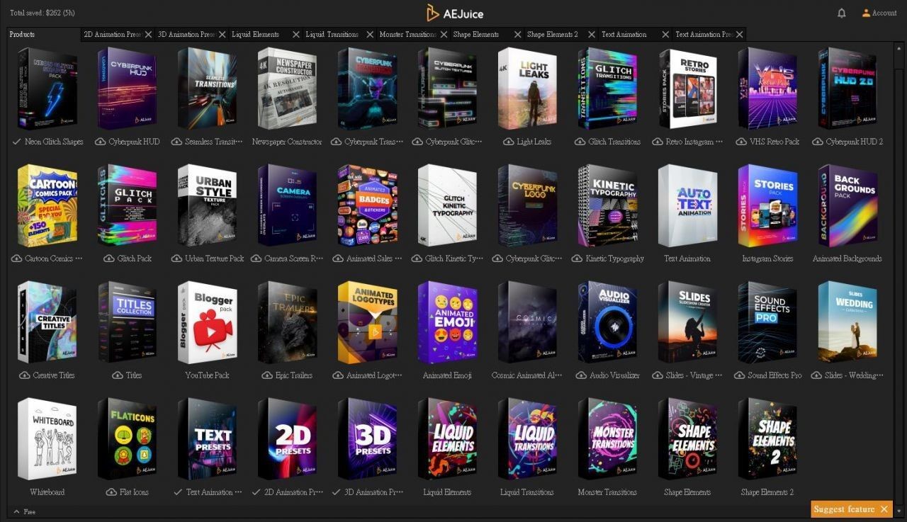 AEJuice 是一個動態素材庫,擁有超級豐富的動態素材與轉場效果,使用者可以搭配 After Effetcs、Premiere Pro 及 Final Cut Pro 一起使用,從中快速套用各種動態特效。此外,只要安裝好 AEJuice,就會先贈送一組「Starter Pack 組合包」,使用者就算不花錢也能搶先感受 AEJuice 的實用特效;組合包裡內建了超過 100 種的免費動態特效,讓所有創作者能輕鬆將素材運用到專案當中。目前 AEJuice 官方正在限時特價中,原價 8,412 美金的大禮包現在只需 149 美金,有需要的讀者千萬別錯過這次的大好機會,買到賺到!
