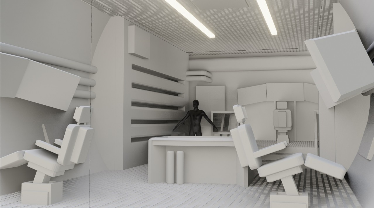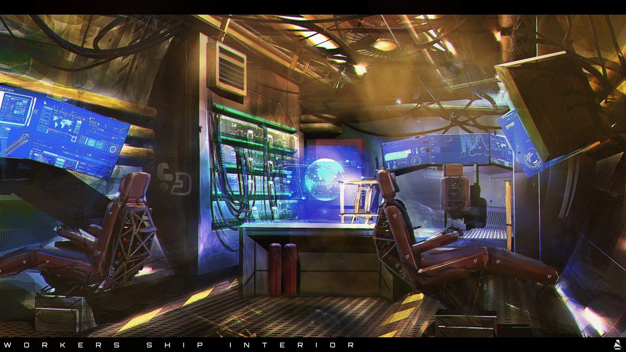 《Workers Ship Interior》是我個人科幻系列作的延伸,最開始是創作《WorkfieldStation》,該圖上有一個小細節,代表工業太空船。在創作時,我先做了船的外觀設計,接著才做內部。 我在 Blender 上雕塑 3D 模型,然後在 Photoshop 進行繪製。