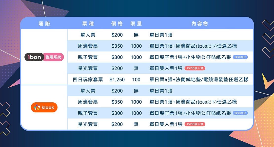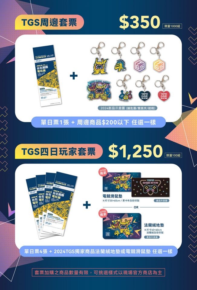 即日起民眾可至 ibon 售票系統及 Klook 平台,以 200 元買到超優惠的 TGS 單人票(原價 250 元),此外還有下午 3 點半後雙人成行即下殺對折的星光套票(200元)、家庭客最愛的親子套票(300元)等。喜愛周邊的玩家也別錯過甫推出的一系列全新商品,包括鑰匙圈、雙面夾、磁鐵等新品,只要購買周邊套票(350 元)就能獲得。若要拼全勤獎的玩家,則可搶購限量 100 組的 TGS 四日玩家套票(1,250 元),除了四張門票外,還可從 2024 年限定新品電競滑鼠墊及法蘭絨地墊中二選一,數量有限,錯過不再。現場不僅可搶先體驗未上市遊戲作品,盡情開玩經典 IP、主機、PC、行動遊戲,也有內容多元豐富的桌遊樂園、Indie House 獨立遊戲等特色專區以及熱鬧非凡的電競賽事、互動挑戰賽等在 TGS STAGE 等著玩家前去探索,購票入場還能參加抽獎活動。