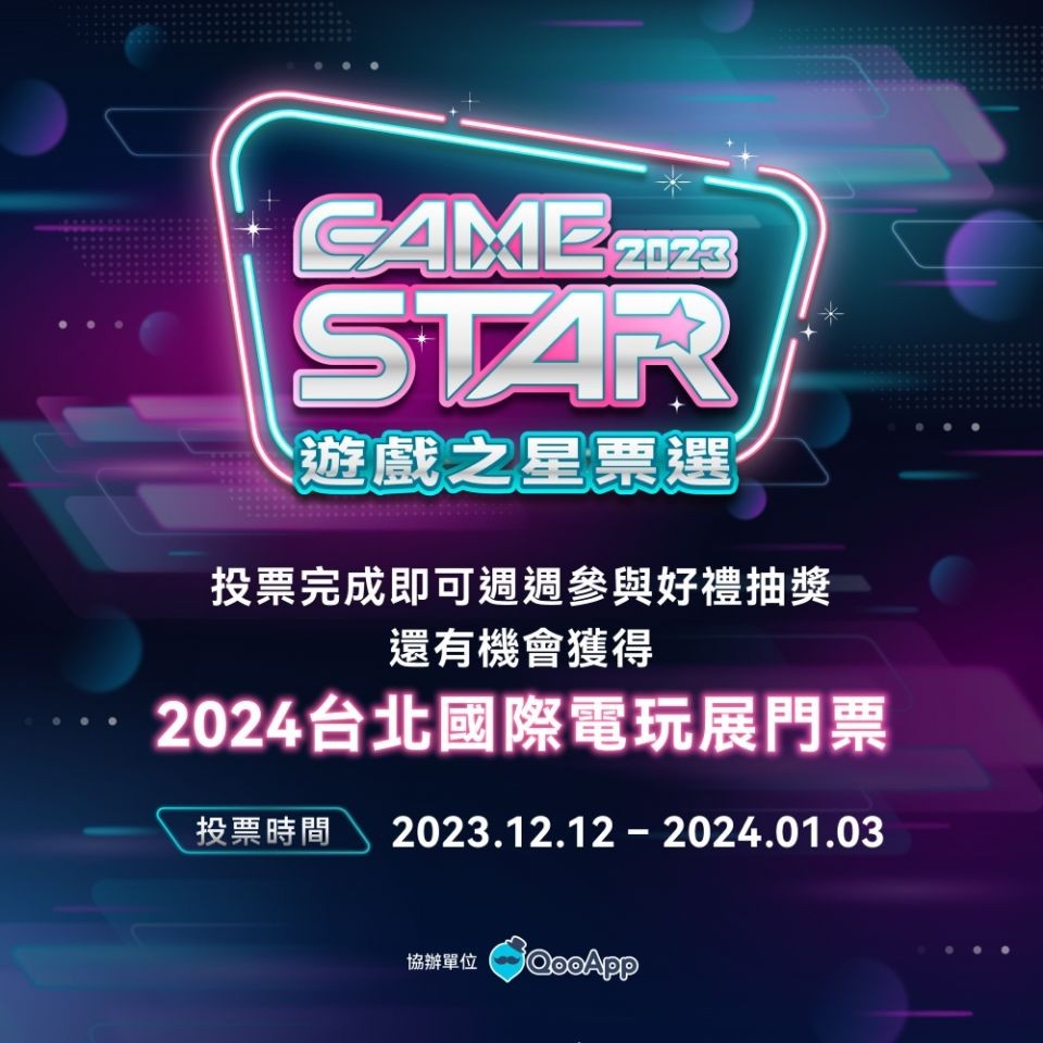 由台北市電腦公會主辦、QooApp 協辦「GAME STAR 遊戲之星票選」即日起至 2024 年 1 月 3 日 14:00 止,玩家可透過 Facebook 帳號參與,投票支持當年度最喜愛的遊戲。為鼓勵玩家共同參與,凡於活動期間完成投票即可參與好禮週週抽,最多可享 3 次抽獎機會,精美獎品總價值超過 50 萬元,邀請玩家為喜愛的玩家打 Call、投下珍貴的一票。