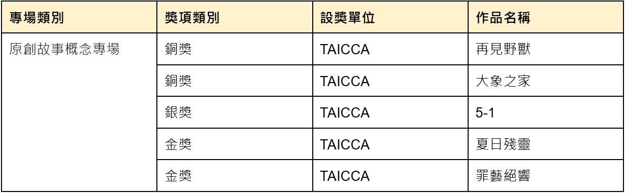 亞洲重要內容產業盛會「2024 Taiwan Creative Content Fest 創意內容大會(TCCF)」於 11 月 8 日舉行閉幕與提案大會頒獎典禮,今年大獎「TAICCA X CNC AWARD」首獎由光之塔動畫事業有限公司《雲影傳說》獲得,「TAICCA AWARD:Best Story」由鯨嶼文化的漫畫作品《器官拼圖》獲得,分別抱回 3 萬美金與 30 萬元新臺幣獎金。此外,經評審團建議,因 TCCF 的提案類型十分多元,內容也都非常的優秀,文策院特別加碼增設「評審團特別獎」頒給韓國、卡達、丹麥 3 國合製的紀錄片企畫案《The Alleyway》,並提供 30 萬元新臺幣獎金給予鼓勵,期盼未來能催生更多具市場潛力提案!