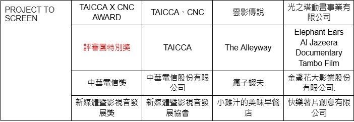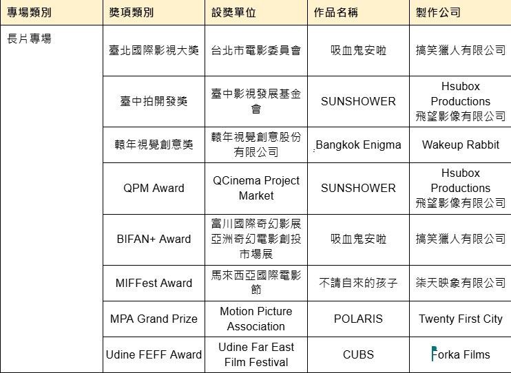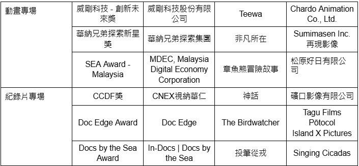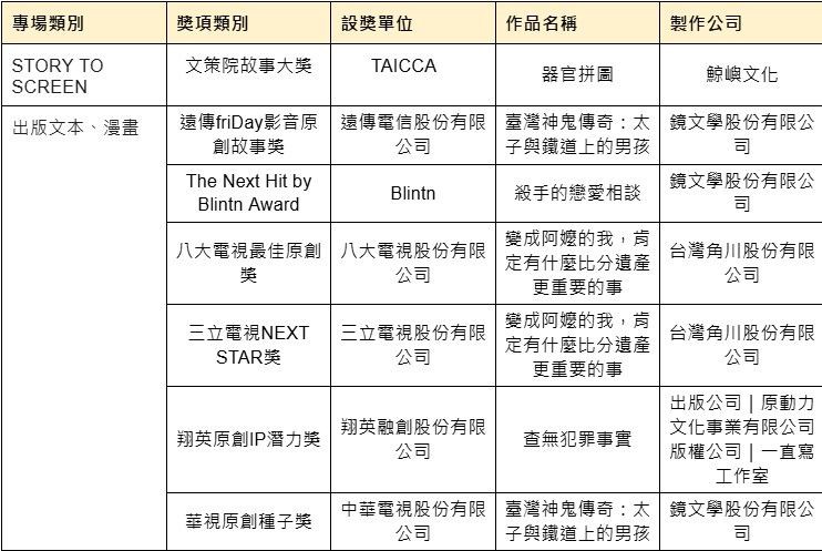 今年「PITCHING 提案大會」提案類型多元,評審團更認為內容相當優異,不少作品同時獲得多個獎項,包含《臺灣神鬼傳奇:太子與鐵道上的男孩》獲得「遠傳 friDay 影音原創故事獎」與「華視原創種子獎」;《變成阿嬤的我,肯定有什麼比分遺產更重要的事》獲得「八大電視最佳原創獎」與「三立電視 NEXT STAR獎」;《吸血鬼安啦》獲得「臺北國際影視大獎」與富川國際奇幻影展亞洲奇幻電影創投市場展展會邀請獎「BIFAN+ Award」等。