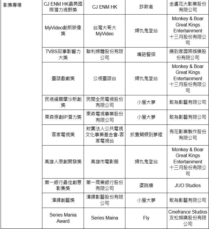 此外,影集專場的作品《婦仇鬼登台》與《小屋大夢》兩部作品也都獲得3個單位肯定,前者獲得「MyVideo 創新映像獎」、「臺語戲劇獎」和「高雄人原創開發獎」,後者則得到「民視福爾摩沙新創獎」、「東森原創 IP 潛力獎」以及「澤緯創藝獎」。