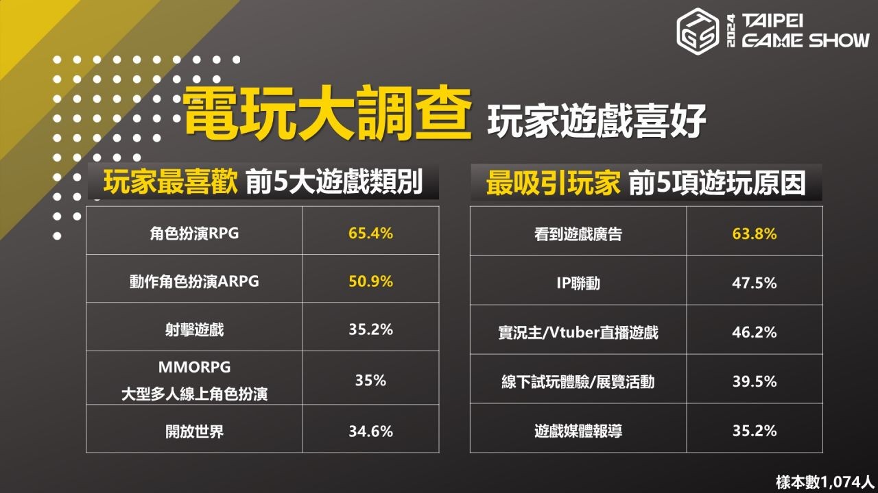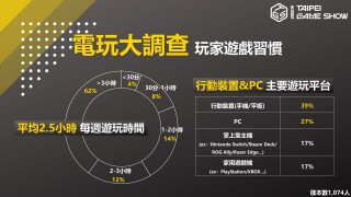 為深入了解玩家對 TGS 的期待,主辦單位特地在 10 月進行了問卷調查,共有 1,074 名玩家熱情參與,其中對於慣用的遊戲平台,仍以近年來熱門的行動遊戲掛帥佔據 39%。而 PC 平台市占率也急起直追,在此次調查中共有 27% 玩家愛用,而主機及掌上型主機則是平分秋色,各占 17%,同時顯見整體主機遊戲市場仍不容小覷;問卷中也呈現了,玩家最易受吸引入手新遊戲的理由,除了吸睛的廣告行銷外,動漫、遊戲或各種 IP 跨界聯動,也是令人心動的重大因素。