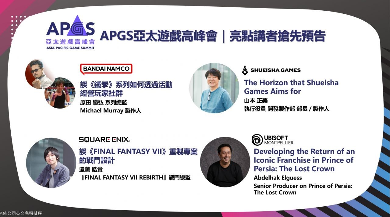 TGS 除服務玩家外,也將於 1 月 25 日至 26 日同期舉辦 B2B 商務區及亞太遊戲高峰會,其中亞太遊戲高峰會的 2024 年度大會將邀請萬代南夢宮娛樂《鐵拳》系列總監原田勝弘與製作人 Michael Murray,SQUARE ENIX《FINAL FANTASY VII REBIRTH》戰鬥總監遠藤皓貴,還有 SHUEISHA GAMES 執行役員開發製作部長兼製作人山本正美、Ubisoft Montpellier《波斯王子:失落王冠》資深製作人 Abdelhak Elguess 等重量級講師解析遊戲產業的各個面向。