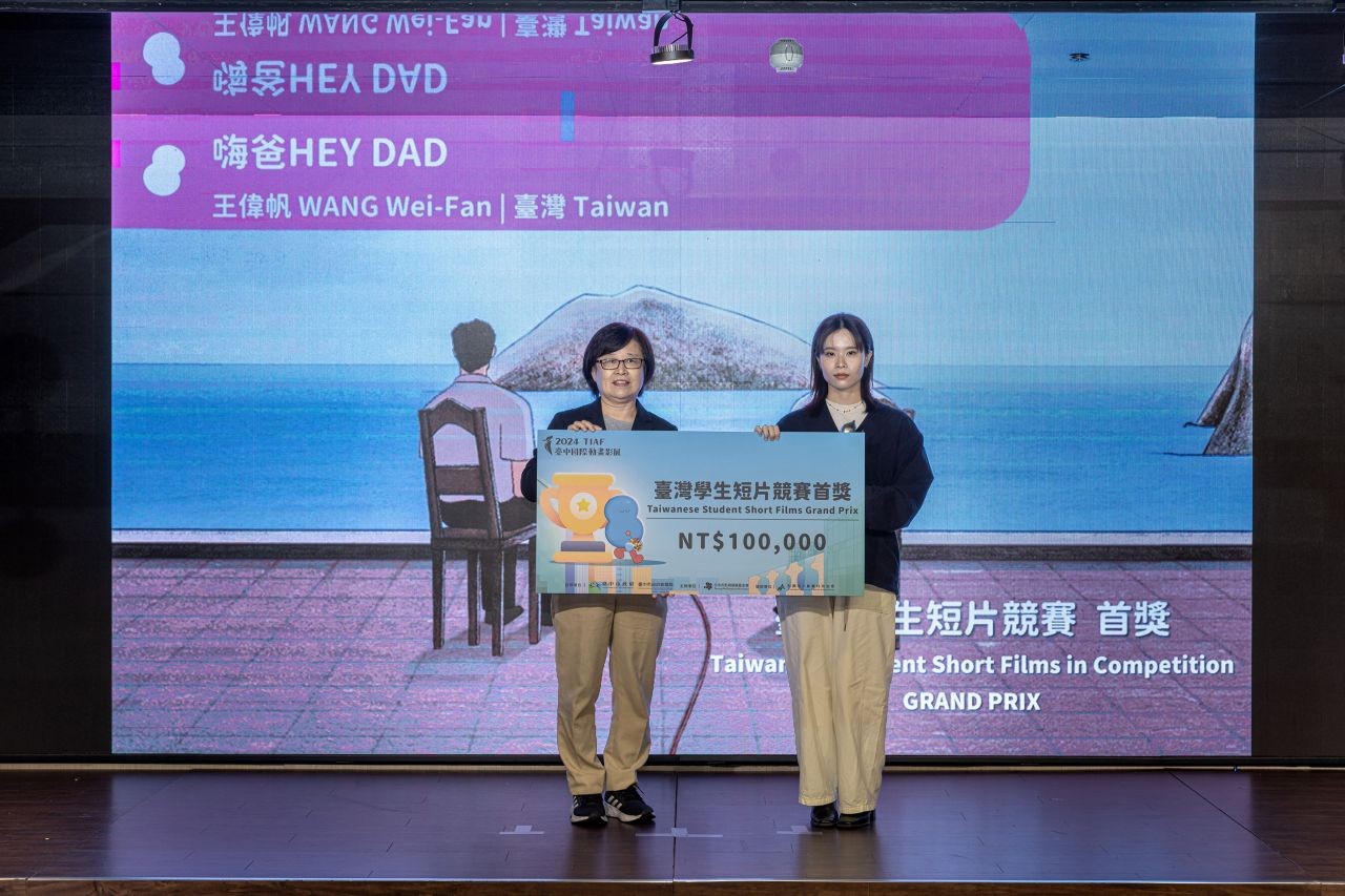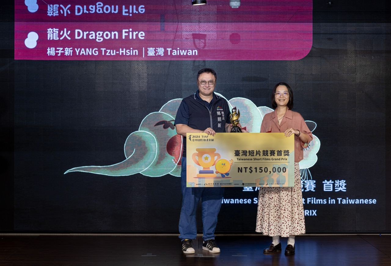 2024 台中國際動畫影展 10 月 26 日盛大舉辦短片競賽頒獎典禮,由台中市政府副市長鄭照新、台中市新聞局副局長陳瑜、台中市影視發展基金會副執行長張婉榆偕同初決審評審團及國際影人共同揭曉。國內動畫界最引頸期盼的「台灣短片競賽首獎」及「台灣學生短片競賽首獎」分別由楊子新導演的《龍火》(Dragon Fire)及王偉帆導演的《嗨爸》(HEY DAD)斬獲殊榮。今年入選的台灣動畫作品劇情繽紛且技法多元,奪下多項大獎,為動畫影展十週年畫下完美句點。