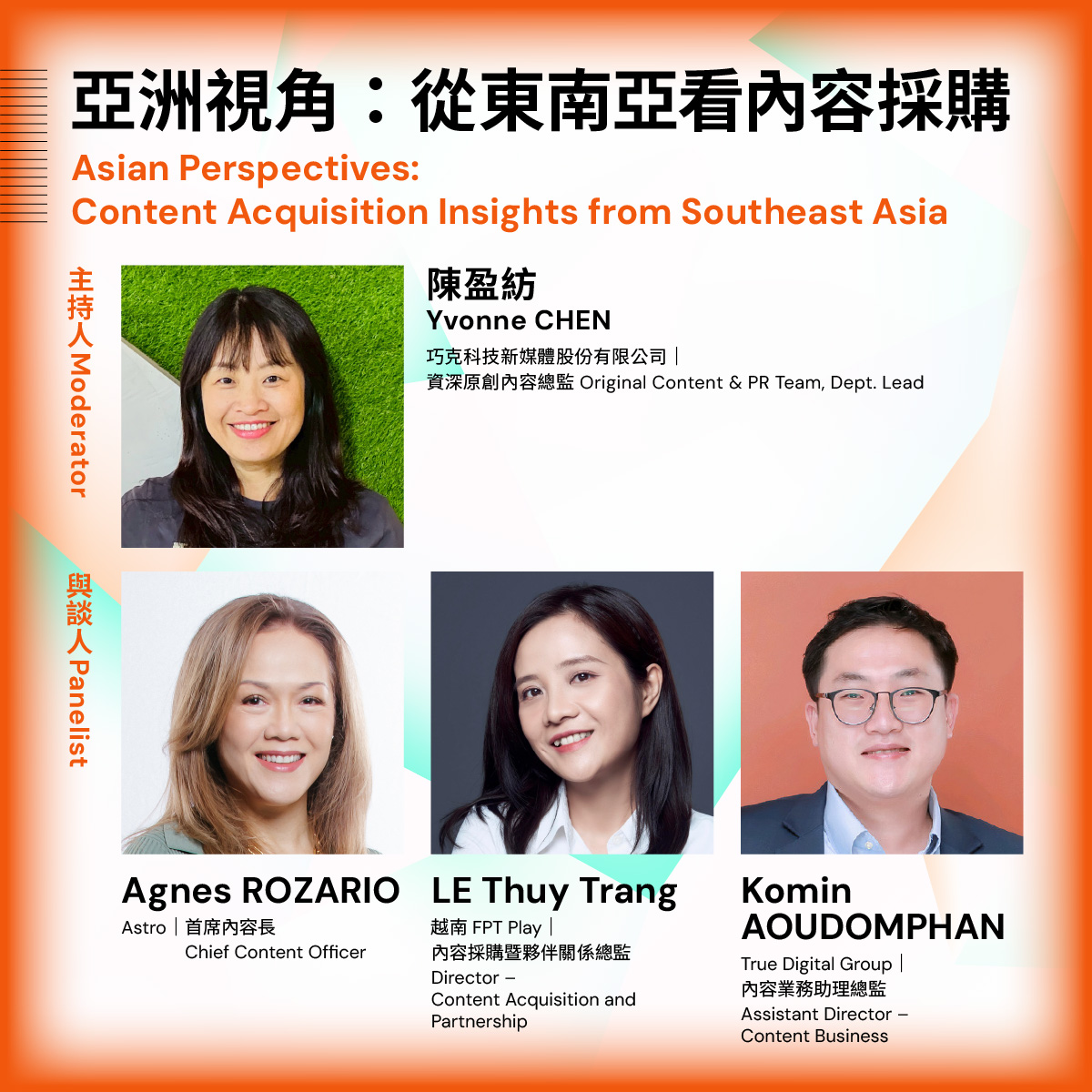 來自越南的 FPT Play、泰國 TrueID 與馬來西亞 Astro 等當地 OTT 娛樂平台代表將齊聚臺北,帶來第一線市場觀點。他們將公開內容採購策略、文化市場考量,以及臺灣影視進入東南亞的關鍵機會!