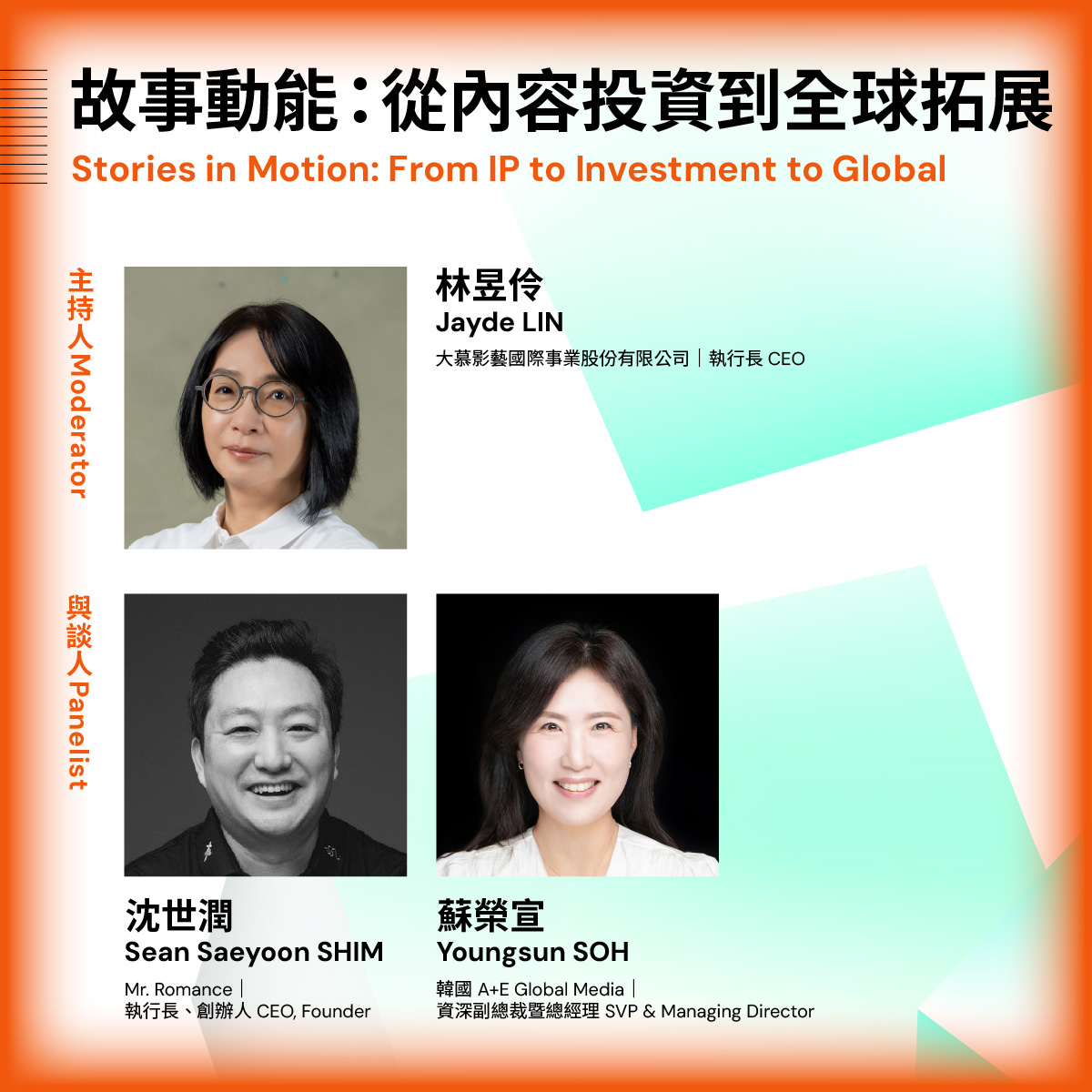韓國內容風靡世界的訣竅在哪?來自韓國 Mr. Romance 執行長沈世潤與 A+E Global Media 韓國資深副總裁暨總經理蘇榮宣,將聚焦內容文本投資與全球化策略,共同剖析從文本選題、內容投資及國際平台合作策略的關鍵實務,分享影視作品如何走向全球市場。