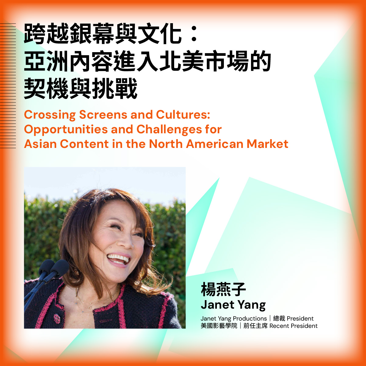論壇活動中最重磅場次,艾美獎與金球獎得主、前奧斯卡華裔主席楊燕子親臨來臺!將曝光亞洲內容進入北美影視市場的第一手觀察,從文化及語言挑戰、國際合作模式及市場趨勢,分享豐富的影視實戰經驗,提供臺灣業者最寶貴的產業洞察。