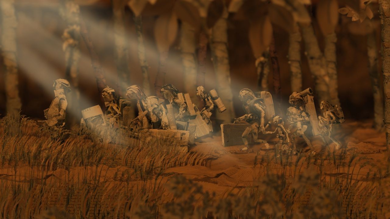 本片利用木偶、剪報摺紙、拼貼等複合媒材呈現,灰暗的色彩反映難民奔波的不安心境,剪影部分更直觀展現藏身地底、廢墟的日常。《移民天堂》從小女孩的視角出發,以活潑的語調絮絮叨叨地敘述,但隨著路程越來越凶險,人口走私收取高額費用後卻將難民們的安全置身度外,她逐漸失去以語言訴說的能力,畫面也數次以失焦凸顯難民的惶恐與無助。直到災難降臨,難民的顛沛流離成為報紙上的新聞,一則則報導卻喚不回逝去的生命。導演直接將新聞剪報展現給觀眾,留下令人省思的震撼彈。