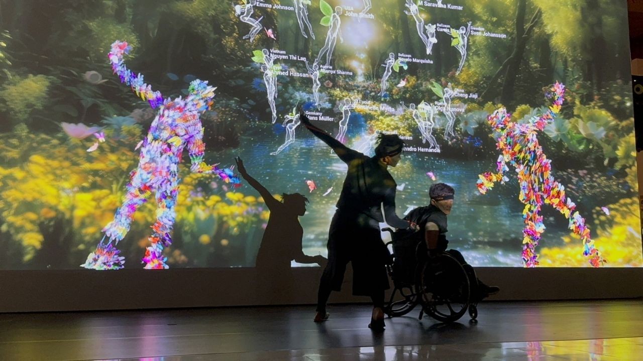 展覽中最受矚目的作品《想嚮》(Imagine)由黃心健、張文杰、張逸軍與蔣榮宗聯合創作,開幕演出後在臺灣引發熱烈迴響,也成功登上林茲電子藝術節等國際舞台。作品以 John Lennon 經典歌曲〈Imagine〉為核心的演出,結合 5G 連線技術、8K 立體投影與 AI 生成影像,展現了震撼人心的舞蹈表演。在開幕表演活動上,由國際知名舞蹈藝術家張逸軍領銜,與輪椅舞者鄭祐承及全球 15 人國際連線共同演繹,作品中藝術家們直面紛亂的國際局勢,透過肢體語言及科技影像相互交融,展現愛與和平的渴望,深深觸動現場觀眾。