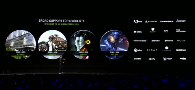 自RTX 光線追蹤技術問世至今不到一年,光是在藝術設計領域,針對複雜的模型和場景進行即時的光線追蹤互動,高效率地製作出逼真影像。導入支援的供應商,包括像是 Autodesk、Adobe、Unity、Unreal Engine 以及 Pixar 等等。在這樣的合作下,也已經造福超過 900 萬名創作者。從黃仁勳在 Keynote 的發表來看,全球頂尖應用程式供應商,將陸續推出支援 NVIDIA RTX 光線追蹤技術的新版軟體,據市場調查公司 Cambashi 的數據,今年底預計將會造福超過 5 億名藝術家與設計者。
