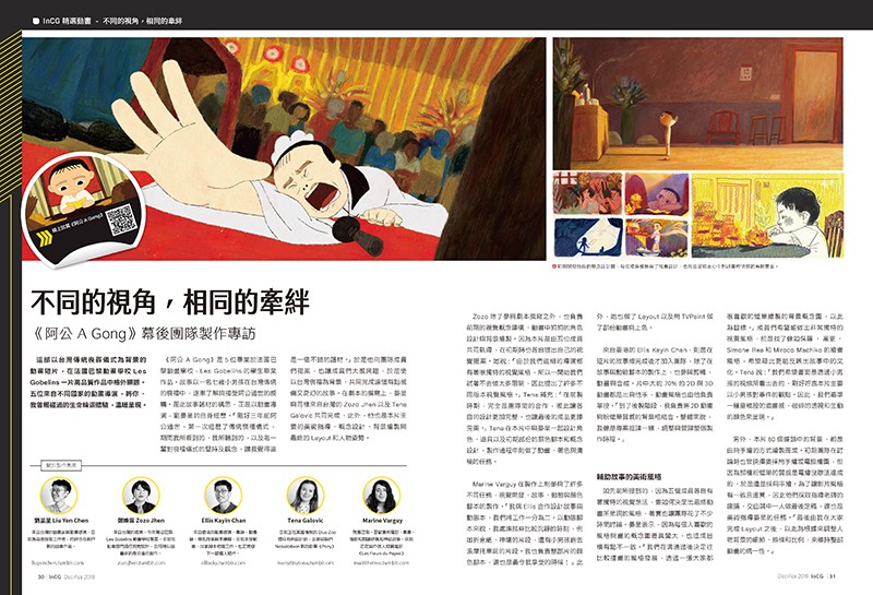 為了呼應本期兩大主題「美力臺灣」以及「IP為王 - 前進國際, 動畫展銷攻略」,我們特別挑選了一部以台灣傳統喪葬儀式為背景的動畫短片《阿公 A Gong》幕後專訪,以及兩部來自法國的原創與 IP 改編的動畫影集《JAX》和《Billy the Cowboy Hamster》。