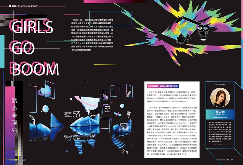 以「Color Bar」彩色條紋訊號為設計主軸的金鐘53,成功打造出令人驚艷視覺饗宴。由總監曲定瑞招集,並由獲獎無數的趙安玲導演統籌,打造一批以女性創作者為主的製作團隊,呈現更具細膩的創造力。雖然典禮已完美落幕,但「她們」的故事還沒結束;我們以「GIRLS GO BOOM!」作為起點,帶領讀者們一同了解每位創作者獨有的風格與創意思維吧!