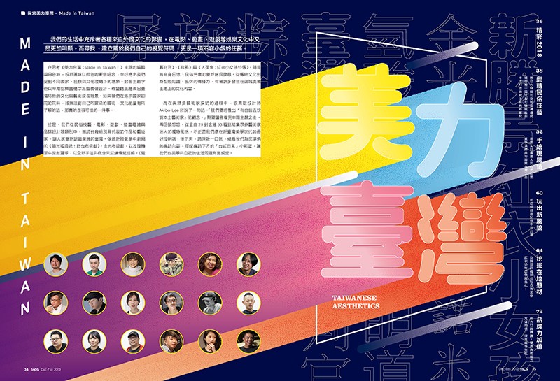 在思考《美力台灣:Made in Taiwan!》主題的編排與用色時,設計團隊以顏色的漸層組合,呼應出我們受到不同國家、民族與文化浸融下的意象。封面主題字也以早期招牌圓體字為靈感做設計。希望藉此體現出臺灣特殊的文化與藝術成長背景。如果我們在追求自我認同的時候,卻無法對這塊土地上所富涵的藝術、文化能量有所了解的話,那真的是很可惜的一件事。於是,我們從民俗技藝、電影、遊戲、插畫電繪與品牌設計等類別中,邀請到十組別具代表性的作品和創作者,讓大家重新認識美麗的臺灣。像是新勝景掌中劇團的《隨光搖滾吧!野台布袋戲》、金光布袋戲,以及旋轉犀牛原創團隊,以全新手法與概念來延續傳統技藝。《螢幕判官》、《粽邪》與《人面魚:紅衣小女孩外傳》,則是自身回憶、民俗元素的重新挖掘發展。從傳統文化到新型態知識、品牌的傳播力,有著許多發生在這塊美麗土地上的創意內容。