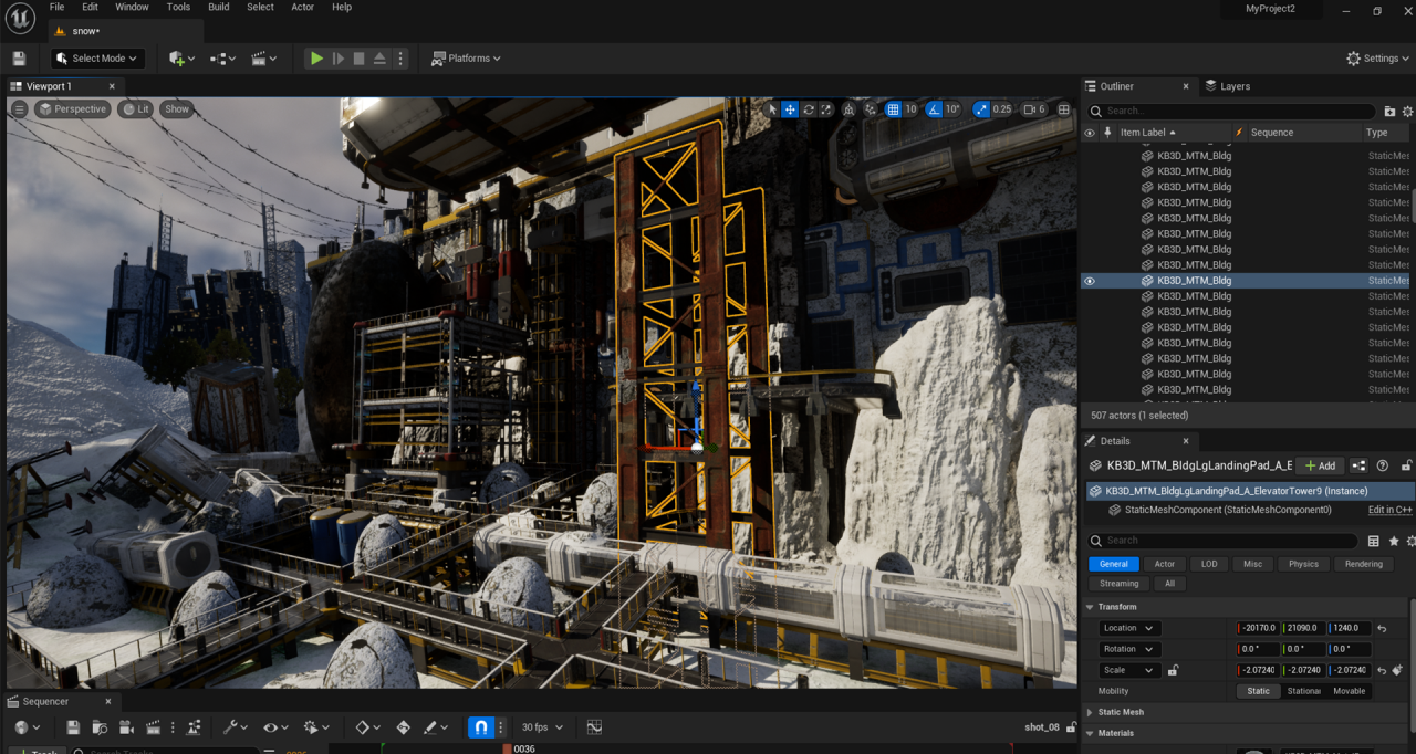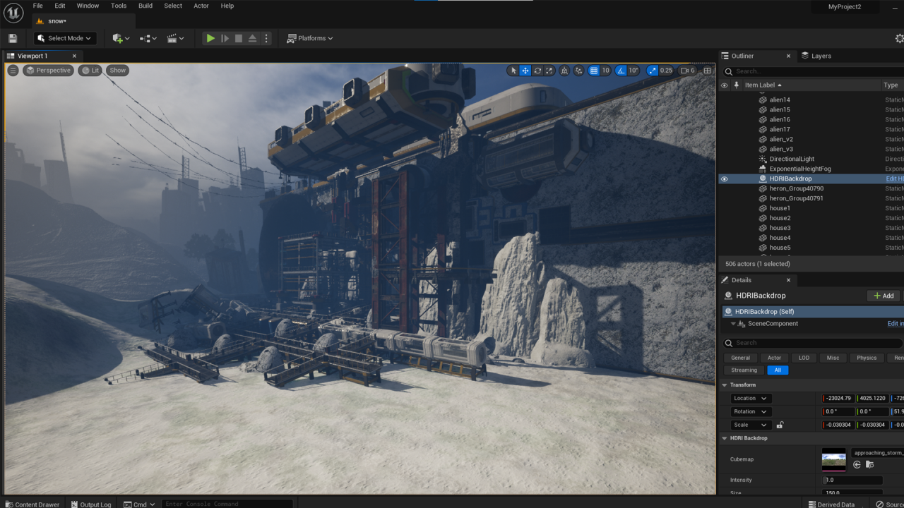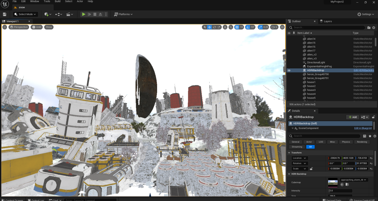由於場景是雪地,期間需多觀察雪地參考及顧慮周圍物件在場景中會如何呈現,所以我會善用 Quixel Bridge 材質球,將適合的材質作測試並細修數值,Quixel Bridge 的 Decals 也是我在這件作品常使用的貼圖,它能使我在一些廢墟的物件中增添破損感,而調整參數是很微妙的,須不斷嘗試才能達到理想的質感。
