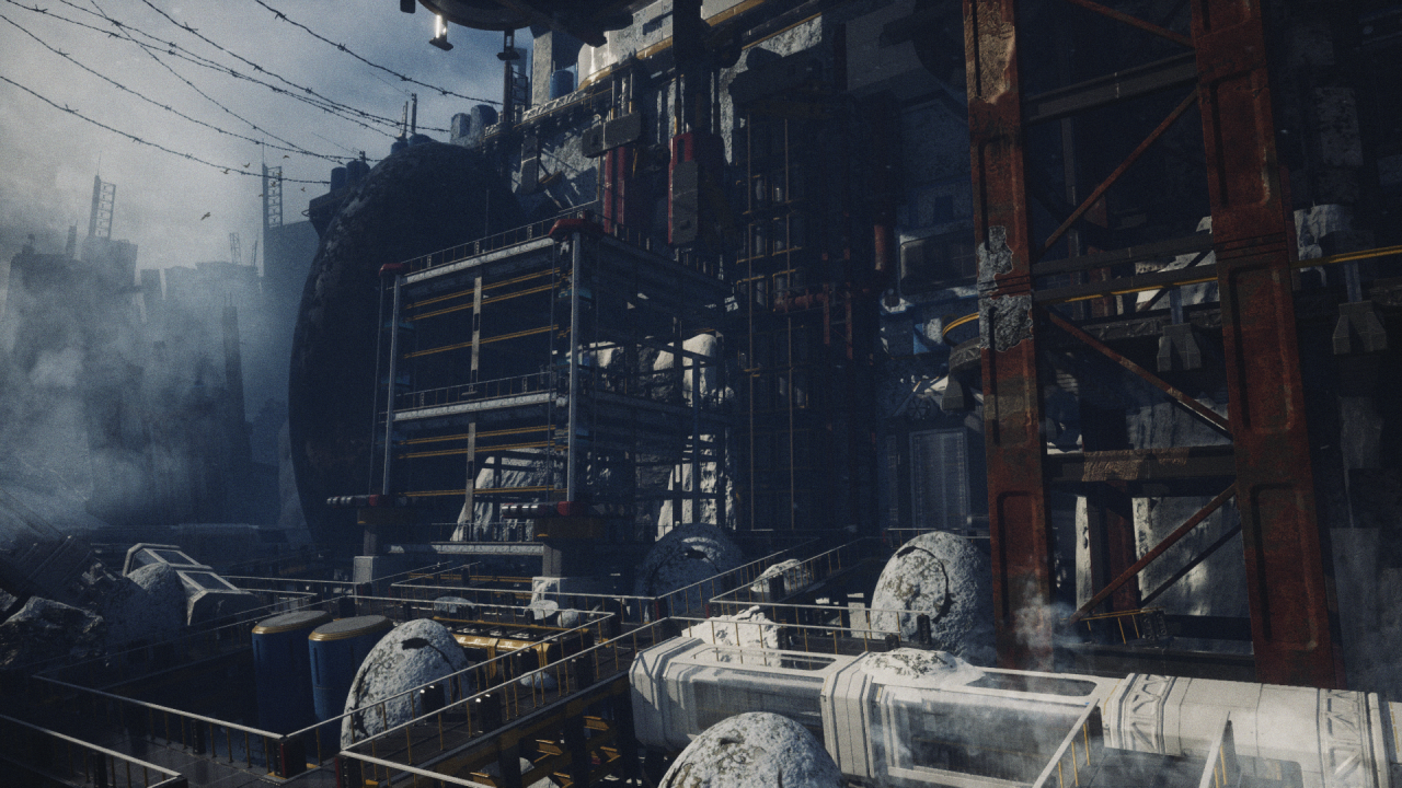 楊博鈞:一開始我會先在 Behance 和 Artstation 上尋找概念藝術激進靈感,並使用 PureRef 蒐集一些參考資料及彙整分鏡,從不斷篩選參考圖中奠定風格及色調,接著開始製作心智圖,利用文字延伸整理出畫面中會出現的物件。為了營造孤寂、寒冷、詭譎的氛圍感,創作者需善用鏡頭語言,它能利用鏡位去幫助述說故事,並讓美術質感提升。此外,模型材質及燈光表現都需要透過多次嘗試,才有辦法探索不同的創作可能性,且由於畫面設定為廢墟場景,我會利用後製增加塵埃及煙霧素材加強災難後的景象。軟體上是主要是使用 UE5 進行作業,其他輔助工具則會利用 C4D 進行建模及 After Effects 製作後期合成調色。