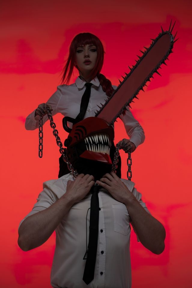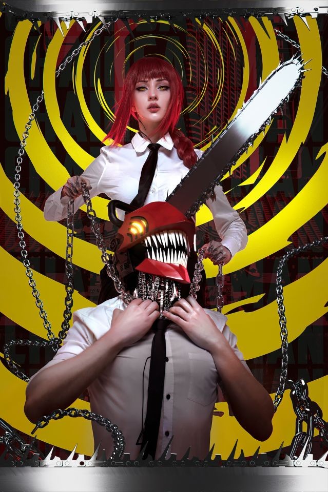 Aku 悪:是的,Makima 和 Denji 都是由真人扮演。背景的漩渦是透過 Illustrator 製作的,而 Blender 則用於其他背景元素,例如鍊子、鋸子。這個創作的目的是為最終構圖添入一些 2D 要素,在擁有 2D、3D 和真實元素的條件下,混合這些類型的圖片是相當艱難的任務。