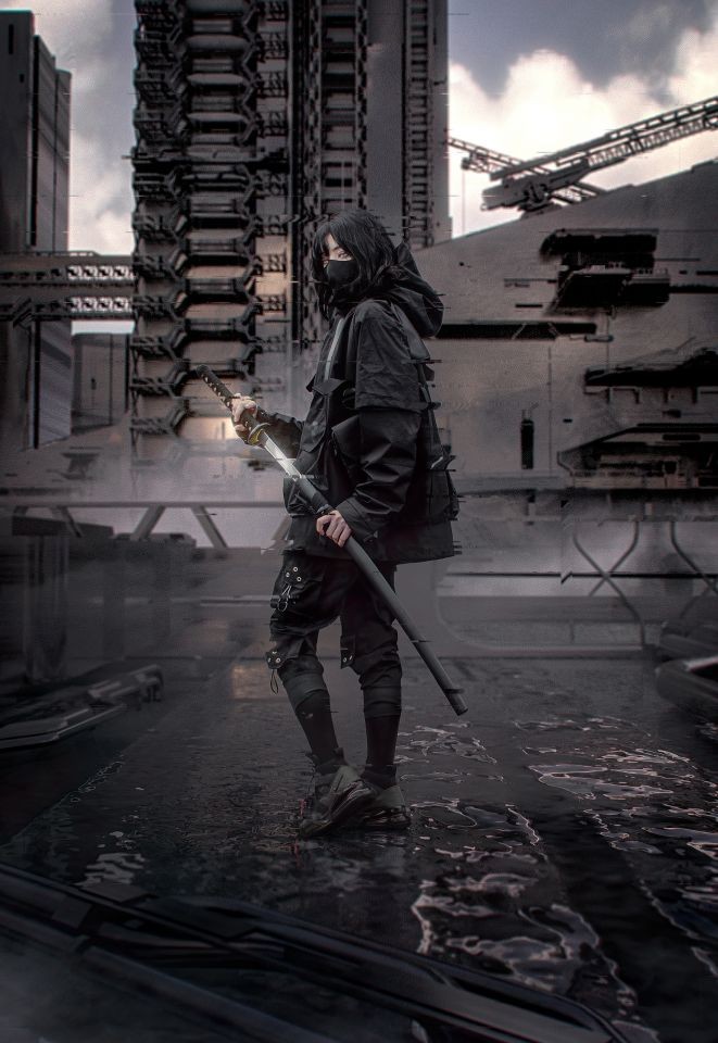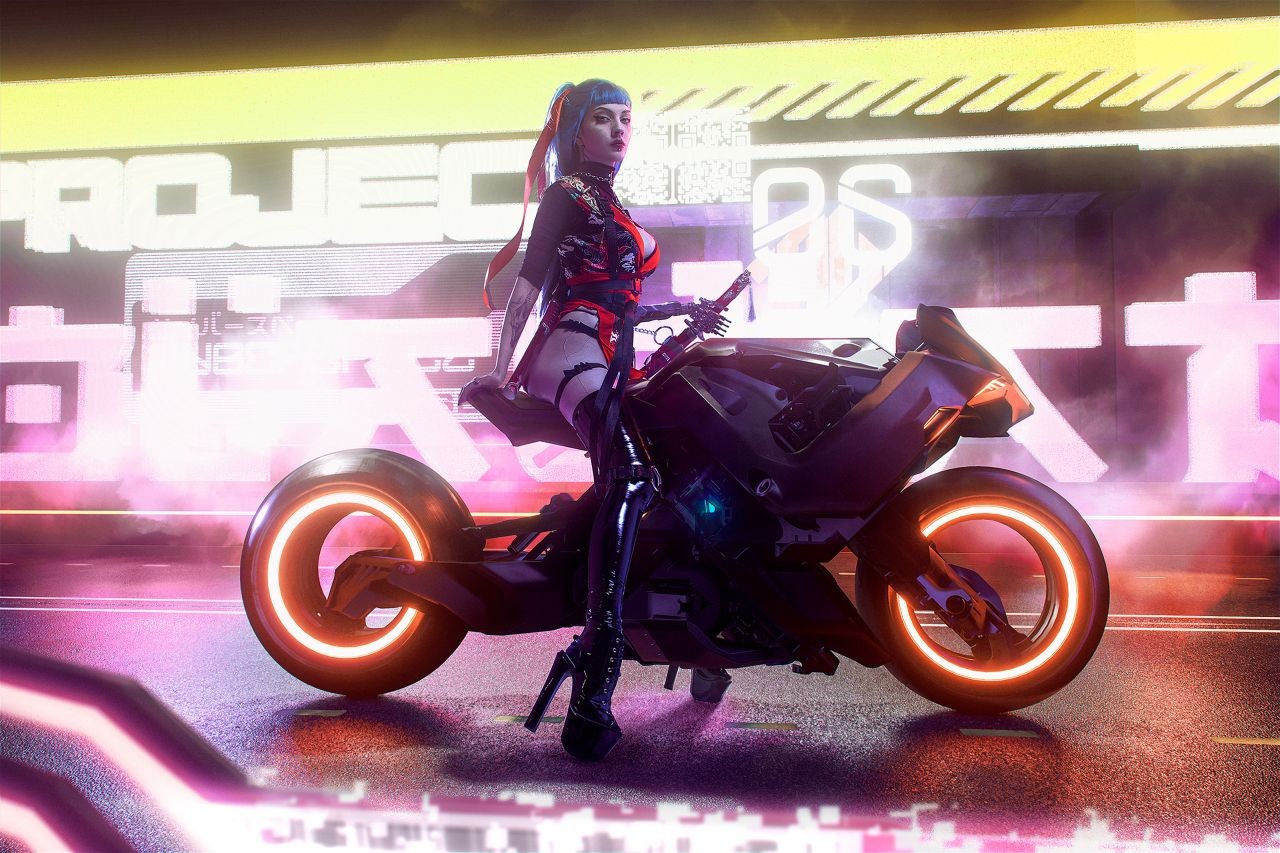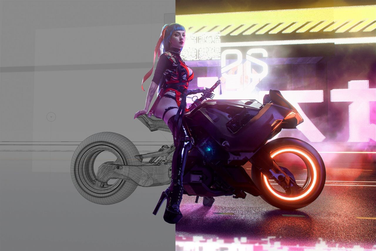 Aku 悪:這花了我很多時間,因為這是一個原創的想法,而非 cosplay。由於賽博龐克風是我的最愛,因此我熟悉於這樣的創作。每個霓虹燈在 Blender 中作為平面的發射光,並與機車、地面和我後來在 Photoshop 中製作的模型進行互動。