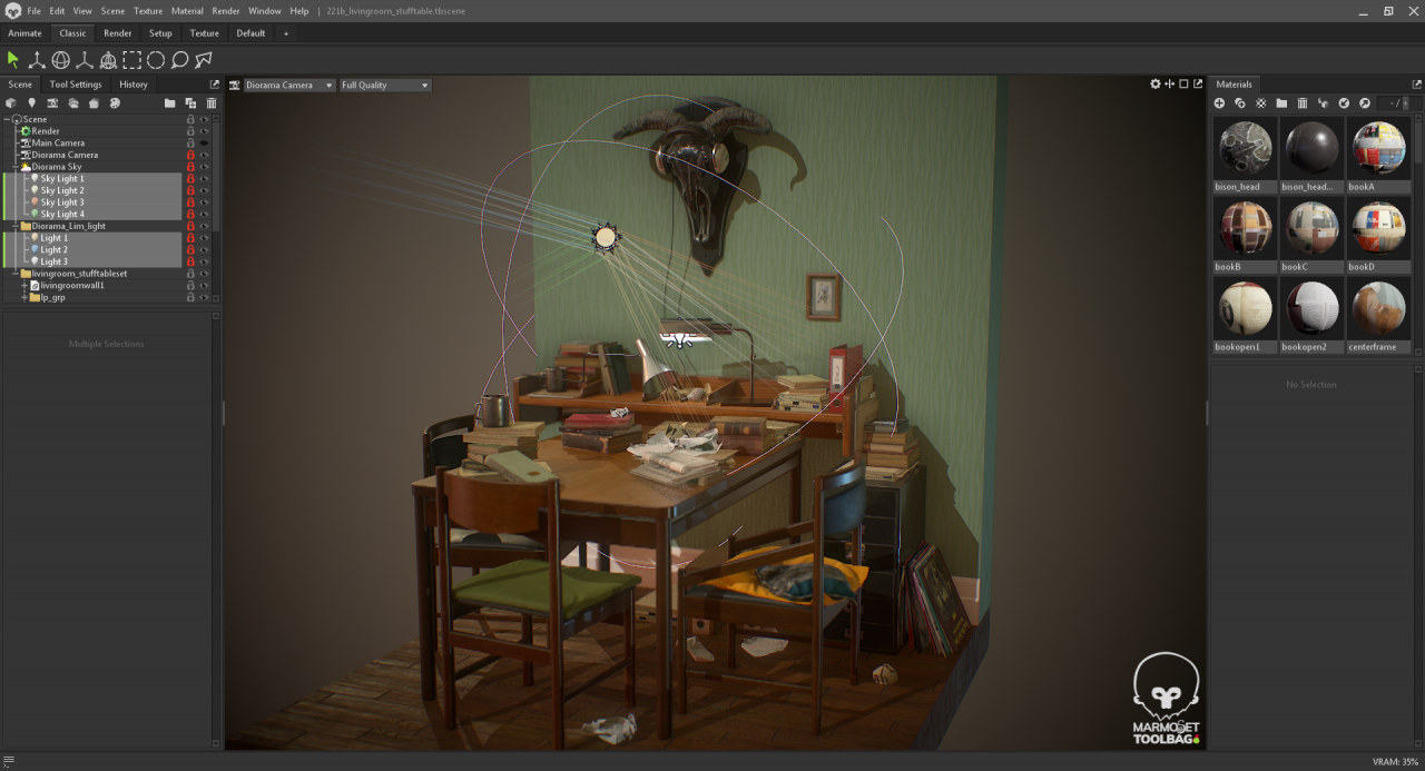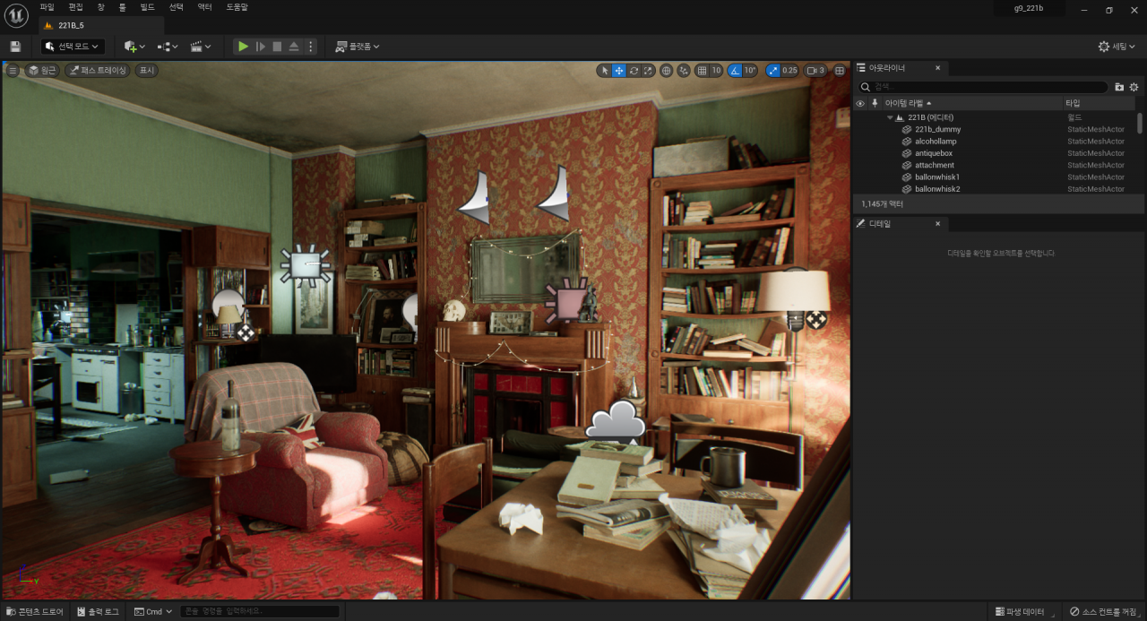 G9:首先,有 64 種不同類型的書籍。富有知識且雜亂無章的書架代表了福爾摩斯這個角色。如果只用於 Maya,我可以使用外掛輕鬆放置它。 由於這是第一次學習和使用 UE,因此有很多事想嘗試並體驗錯誤。如果是一般熟練的工作者,會在 Maya 中一次完成各種書籍的放置,並防止場景在 UE 佈局中變得沉重,但這次我透過將它們一一堆疊來添加更多書籍。