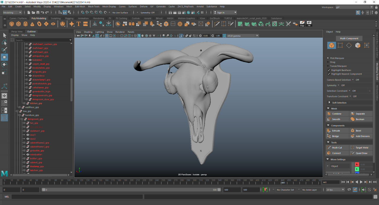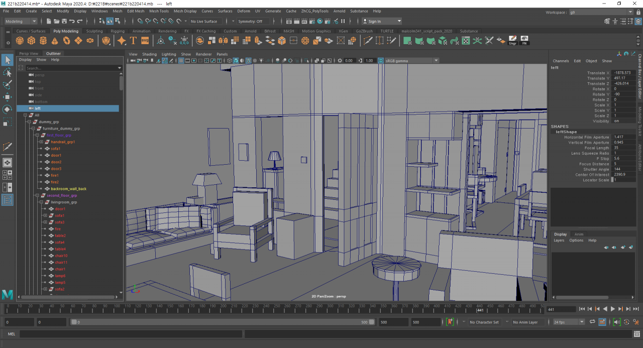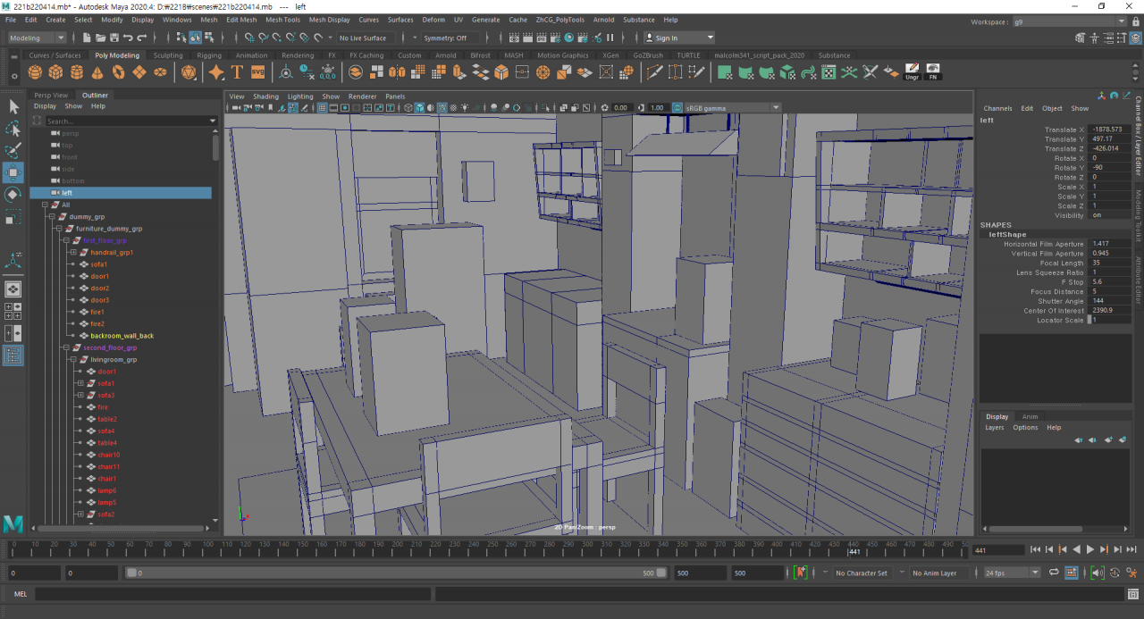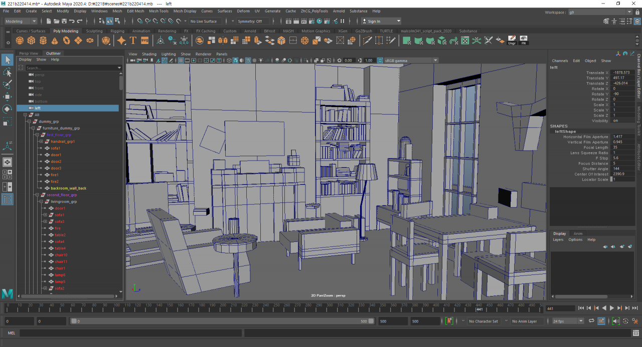 然後在 Maya 中使用 Dummy 設置層級。我將它製作得比白箱更具體一點(可以看到它是什麼類型的道具),並根據其他家具的規模進行佈置。書和瓶子通常不會做 Dummy,但我把書架裝滿了,因為我想知道當它們被放在一個空間裡的感覺。