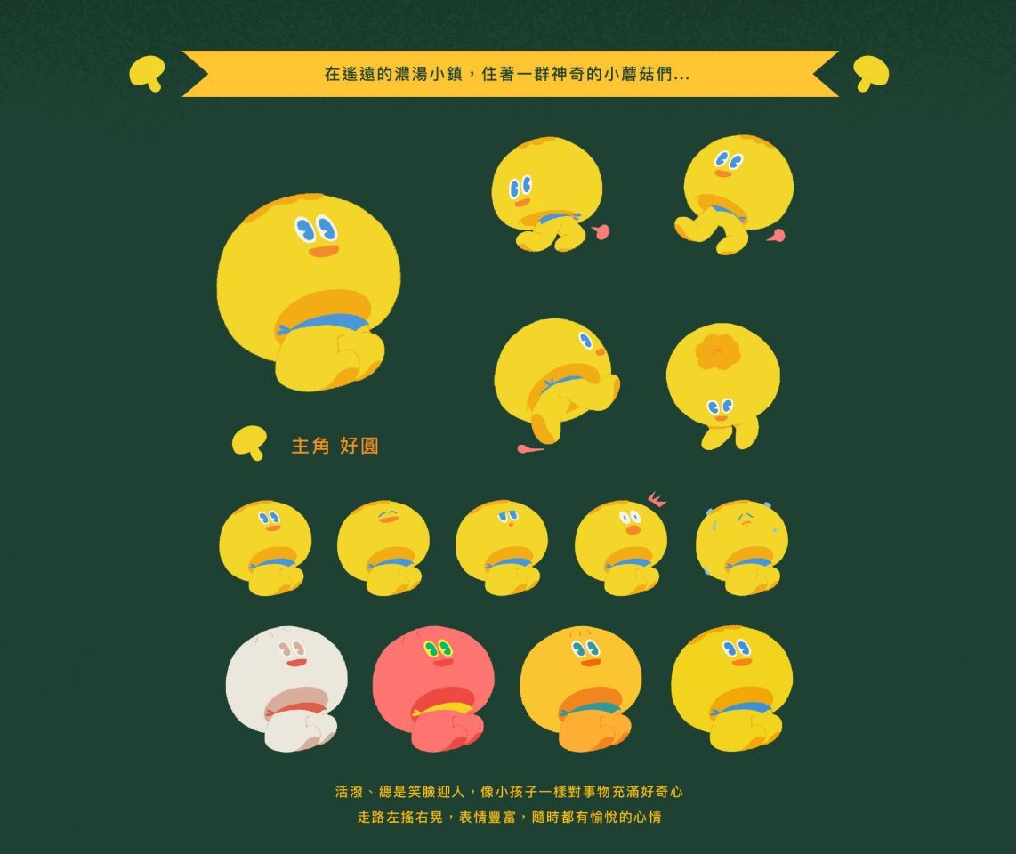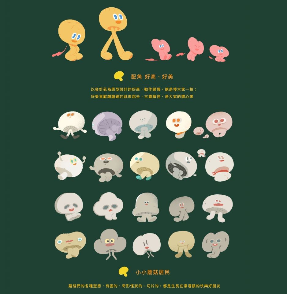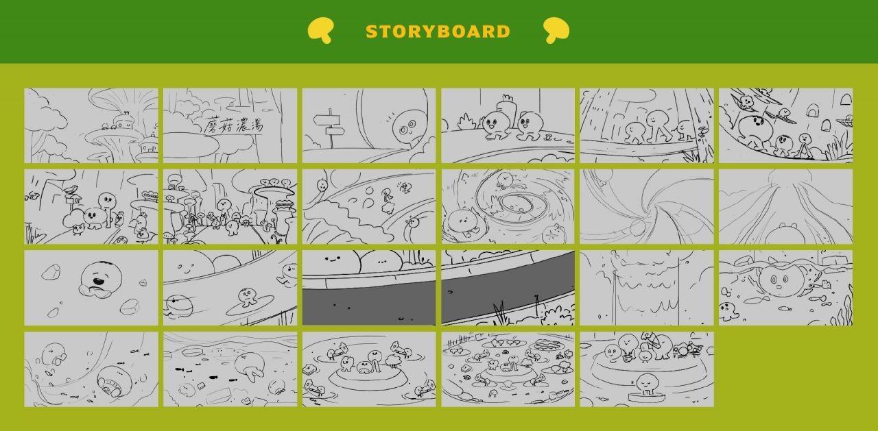 動態設計 / 道欣:第一個困難是三個主角的表演層次和差異,從走入蘑菇森林的過程,面對牛奶海浪,牛奶滑梯到濃湯大合奏,蘑菇們從頭到尾都在鏡頭中,整個過程都需要充滿趣味不能乏味重複,必須在動態表演看出個性差異。首先是主角好圓,身為主角和隊伍帶頭,步伐果斷,眼神四處張望充滿好奇心,而好高則讓他慢半拍,別人走兩步是他的一步,連牛奶海浪來了他都最後才發現。好美則是活躍的小跟班,腳短小碎步跟不上別人就用大步跳追上,表情上讓他有點擠眉弄眼,古靈精怪。
