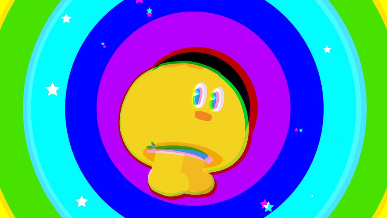 動態設計 / 道欣:聽了音樂之後覺得非常迷幻,所以就很直覺的想了一個主角蘑菇們的超奇幻體驗。故事大概是磨菇進入了迷幻隧道,找到隱藏於深淵的大鍋,在其中加入各種秘傳調味料後就變成火箭升空,基本上是一個無厘頭的小故事。Remix 版的製作方式是用原本正片完成的動畫,拼接新的美術和背景而成,算是一種衍生的製作物。運用色差效果除了增加超現實感之外,也是因為這是個很方便,套用下去就能讓整體和原本的風格有顯著差異的效果,不過當時確實有點下太重了,現在看覺得好像減輕點比較好。