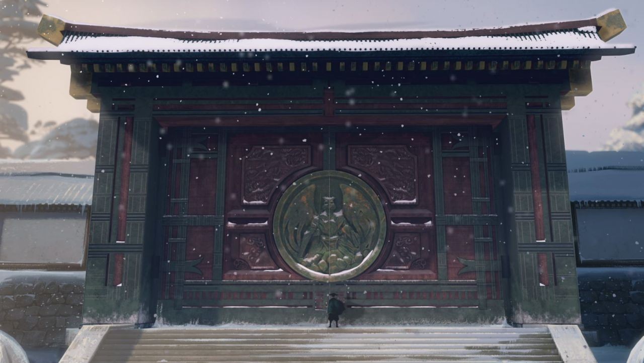 Liam:我個人來說,耗時最長的場景應該就是第一集中 Mizu 前去踢館的新堂道場的大門了。這扇大門的大小在製作過程中,給了我不小的挑戰:左右兩邊的門看起來很對稱,但是貼圖絕對不能複製貼上,怎樣在巨大物體上保持和人物貼圖相差無幾的清晰度,門上的松樹還有鴉天狗的浮雕,如何保證遠景和近景的美觀以及平衡,老舊青銅的筆觸把握,頂上和門上凸起部分的積雪的設計。