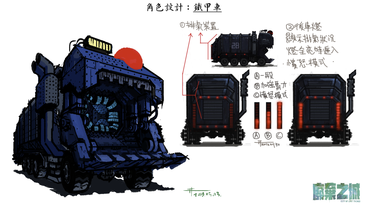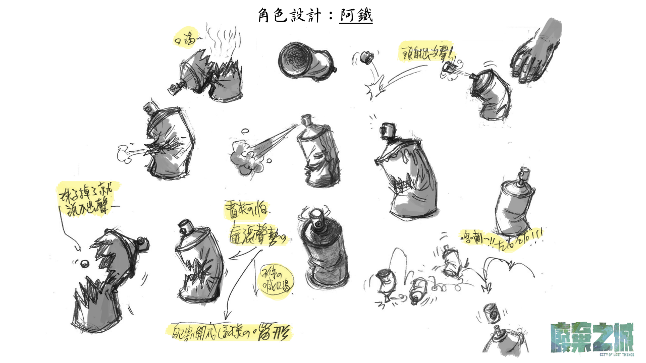 另外也提到本片的最大反派-鐵甲車。美術組為了強化其威脅性,讓人感到害怕。所以將鐵甲車的尺寸誇張化,將車頭設計成巨大的吸盤武器,並帶入 Cyberpunk 的風格,設計出如鋼鐵怪獸般兇猛的角色。至於噴漆罐角色-阿鐵,由於廢棄之城中有各式各樣的廢棄物,但噴漆罐體型非常小,卻又是故事中不可或缺的重要配角,該如何讓阿鐵從這一片廢棄物中跳脫出來,因此美術組在顏色設計上選用最吸引視覺的黃色,讓阿鐵在廢棄城中更加顯眼。