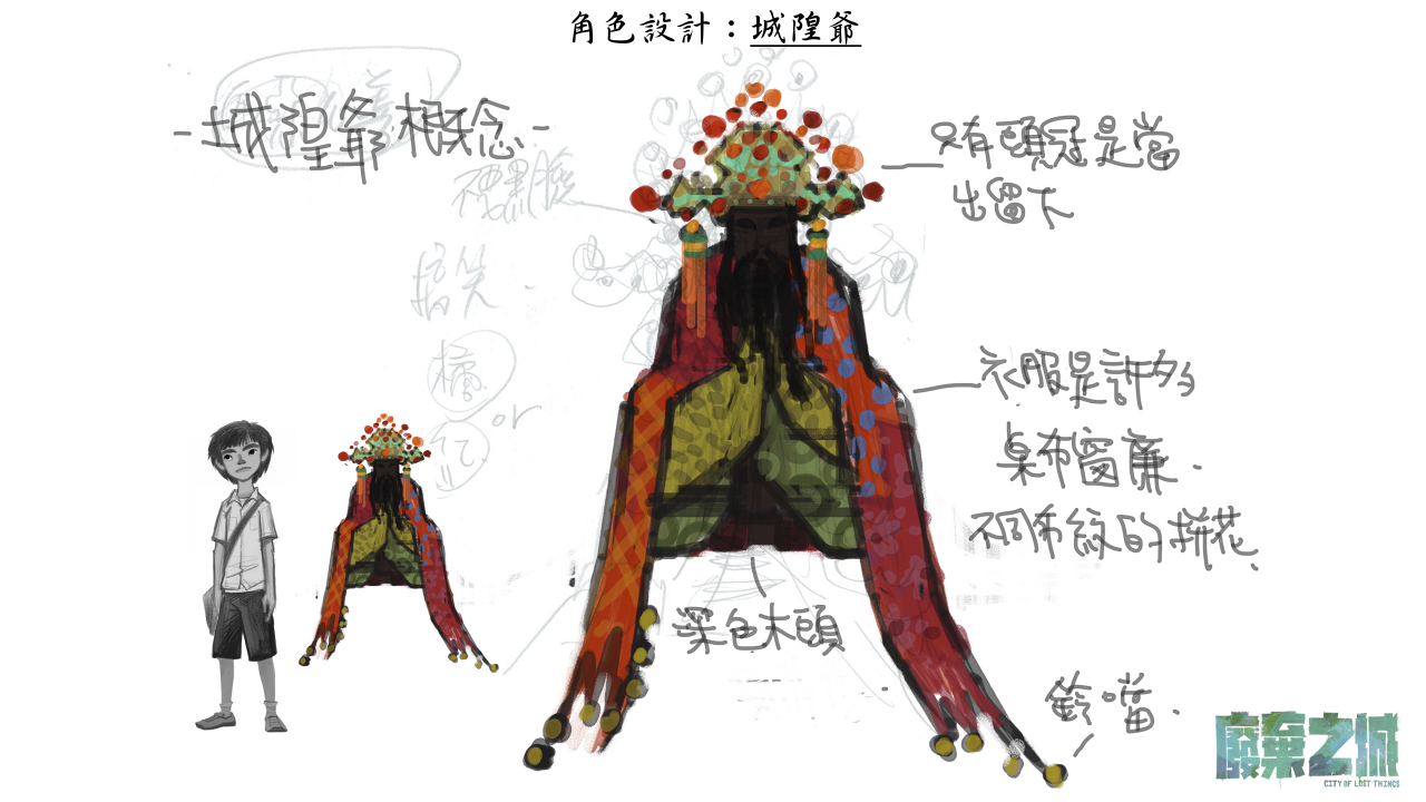 而這麼大的廢棄之城,一定會有掌管這個地方的角色,於是挑選了屬於台灣在地,又必須掌管各路人馬的神明-城隍爺。易導表示:「新聞常看到,漂流在河岸或是流落街頭的神像,因而確立這個角色的設定」美術指導郭景洲也分享,除了加強外表髒汙、壞掉的感覺,城隍爺在動畫表演上更是設計成像是壞掉的木頭人偶,嘴巴會稍微卡卡,眼睛會抖動,像是發生故障般的動態,都是為了強調壞掉的感覺。製片 Vance 則笑稱這是另類的 limited animation (有限動畫)來形容城隍爺的表演風格。