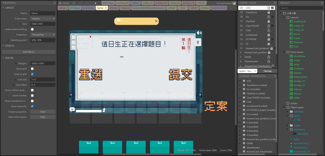 《災難公關》是透過 Construct 3 的遊戲引擎加上 Firebase 的 realtime database製作,這是塔打第一次開發遊戲,因此前期花了大量的時間進行測試。遊戲目前處於 beta 測試階段,從發想到公開測試的發布,已有 4 到 5 個月的時間。最困難的地方還是在於,當遊戲開始有其他玩家也在遊玩時,原本的免費伺服器無法承受太多的流量,因此才改用 Firebase 為基底去重新編寫程式,而近期主要的工作在於卡包的整理和 bug 維修。
