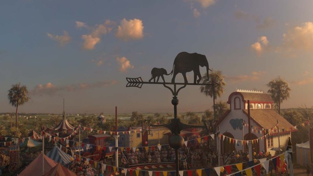 我們確實與 Rodeo FX 和 Framestore 分享了不少資料,但都不是最主要的。大部份是 Comp 的內容。例如,Rodeo 會把 Holt (前嘉年華主辦者 / Colin Farrell 飾) 的手臂移除,並給我們新的片段,讓我們可接著做自己要做的部份。我們也和 Framestore 分享了很多鏡頭,因為他們負責夢想王國樂園馬戲團(Dreamland)的外景鏡頭,而我們在製作小飛象,所以只要有小飛象出現在馬戲團外的畫面都會彼此共享。我們還跟旭日影業 (Rising Sun pictures)分享了我們一起拍攝粉紅大象的片段,由他們負責製作泡泡的部份。
