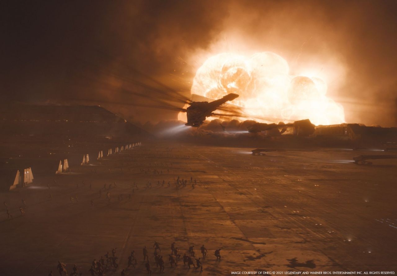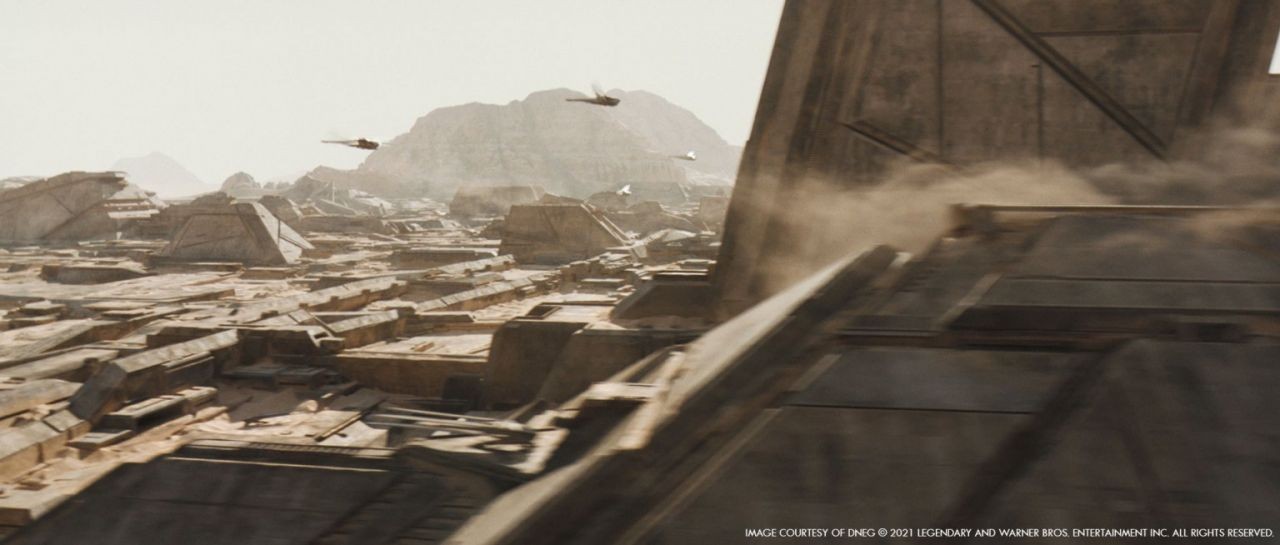 至於翅膀動畫,動畫總監 Robyn Luckham 表示:「我們從 Patrice Vermette 得到動畫草圖,提供我們基礎運行原理。導演希望電影的真實程度大於科幻,所以這部分關鍵在於其重量和運行機制要符合邏輯。」Robyn Luckham 補充:「撲翼機的體型十分巨大,因此他們需要發揮這種強大力量,一開始以緩慢拍打呈現,就像吉卜力動畫《天空之城》如此優雅,但這並不是我所替《沙丘》想要呈現的軍國主義風格。」在沙漠拍攝時,導演丹尼維勒納夫曾提到他對於蚊子印象深刻,於是動畫團隊觀察了蜜蜂、蜻蜓等,發現牠們的翅膀以超快速度拍打來移動,這也讓製作團隊聯想到螺旋槳。為了產生差異,動畫團隊加長了葉片,增強撲翼機重量與易於操控的感覺。另外,他們也會制訂一些規則,像葉片不要間隔太遠,讓機翼在飛行時看起來更有力,但仍然有一些基本的旋轉,展現其能靈活地移動。再來,每個葉片都是獨立的,並不會與其他葉片相交,即使每秒跳動很多次,看起來像重疊在一起,其實每個葉片就像鳥一樣是八字形移動。動畫總監表示:「一旦我們確立了槳葉運動的核心原則,我們將相同邏輯應用於其他飛行工具,對其進行一些調整,使其保持在空中。」