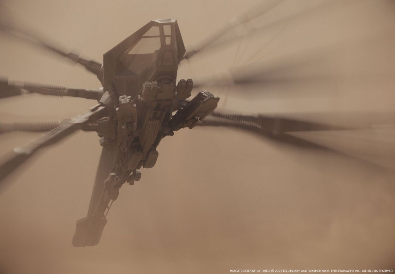 除了無邊無際的沙漠,《沙丘》各種設計精美的太空船,更是讓人驚艷,Paul Lambert 表示:「導演與製作設計師 Patrice Vermette 花了近一年的時間來創造整體世界觀的概念,我們再根據概念圖與 CG 資產構建場景。」其中令人印象深刻的無非是「撲翼機」,由 Patrice Vermette 親自設計,並於倫敦 BGISupplis 搭建。Tristan Myles 表示參觀時就被其大小震撼,同時他也非常擔心駕駛艙會有過多的反射,所幸最後順利解決。Tristan Myles 憶起:「當時有一架重達近 12 噸的撲翼機必須用貨機空運到約旦,我們用起重機將它吊起以模擬起飛和著陸,模擬機翼下降時產生的氣流,團隊也製作全 CG 的版本,以用來補充一些鏡頭。」