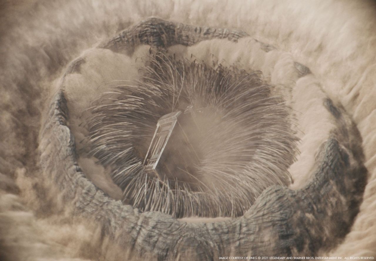 片中最吸睛的絕對是超巨大的沙蟲,製作團隊表示只有少數鏡頭有出現沙蟲,所以要盡可能保持神秘感。因此如何運用沙子遮蔽沙蟲外觀,是十分重要的一部分。針對沙蟲在沙漠地面上移動的幾場戲,Tristan Myles 表示:「這幾場戲我們有向《大白鯊》致敬,讓沙子如海水一般,讓他穿過沙子並撲向主角。為了讓沙蟲與沙子能夠產生自然的碰撞,我們有特別創建模擬沙子的系統,以便在周圍沙子上進行模擬和增強工作。動畫和效果團隊會一同合作,為沙蟲動畫進行反覆修正,最後再由燈光團隊渲染最終效果。」在所有科幻小說中的生物來說,沙蟲是最具傳奇色彩的生物之一,Robyn Luckham 表示團隊十分用心處理沙蟲的動畫表演,他們一起研究陸地和海洋中所有已知的蠕蟲和無肢爬行動物,另外 Patrice Vermette 與導演也提供了精彩概念圖與所有設計細節。他補充:「一開始,我們試圖運用如蚯蚓、蛇般的推動方式前進,甚至以較為堅硬的皮膚斑塊呈現出地底生物的特性。但最後這些變得過於科學化,失去了沙蟲的優雅與威嚴。於是我們針對沙蟲及其環境進行觀察,與其說牠是蠕蟲,不如說更像是沙鯨,它會衝破沙子,卻也完全控制著沙子。一旦我們為沙蟲建立了核心概念,我們就可以利用先前生物研究來增加可信度。」由於是參考鯨魚,因此嘴巴是一大特性,Robyn Luckham 表示:「沙蟲的嘴巴是 Patrice Vermette 為動畫團隊提供最激動人心的設計,它再次體現了透過生物運動的原理。首先我們將嘴部剝離,然後透過肌肉原理構建它,讓其可以收縮、打開和關閉一個圓形大嘴巴。而鯨魚本身的神祕發音,提供導演與聲音設計師一個良好的參考,來替電影中的沙蟲創造可怕的聲音。」