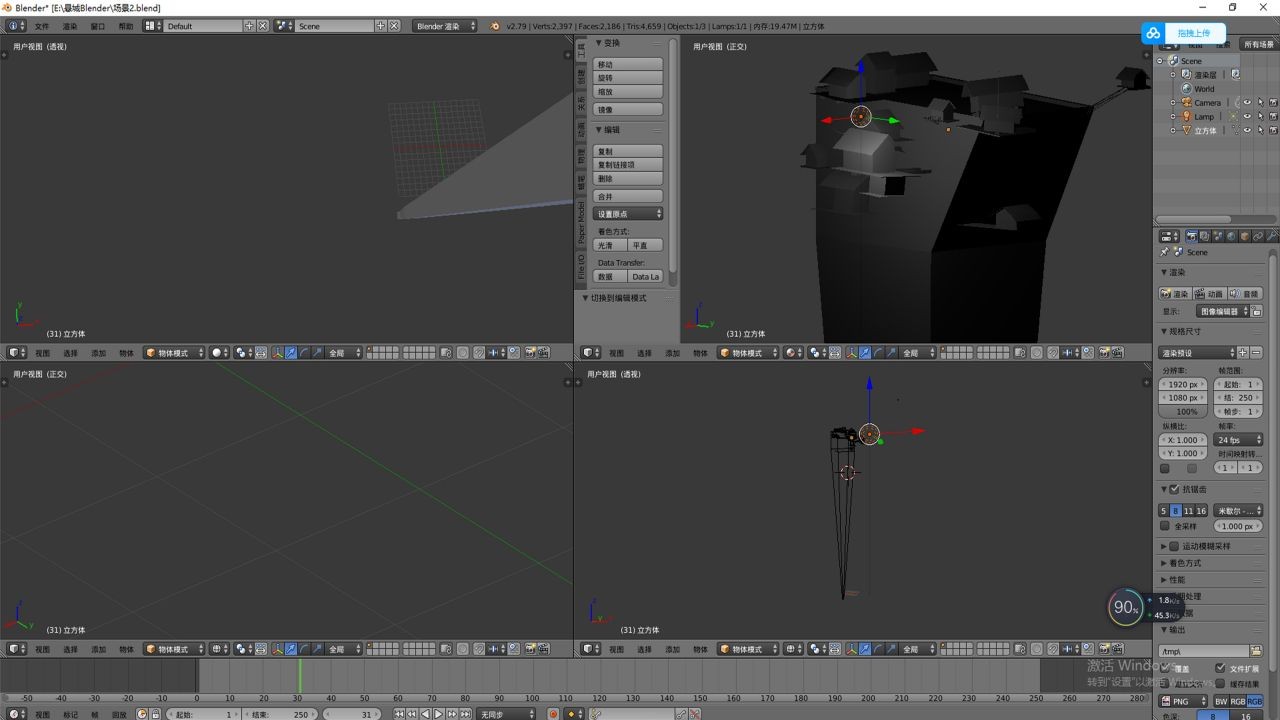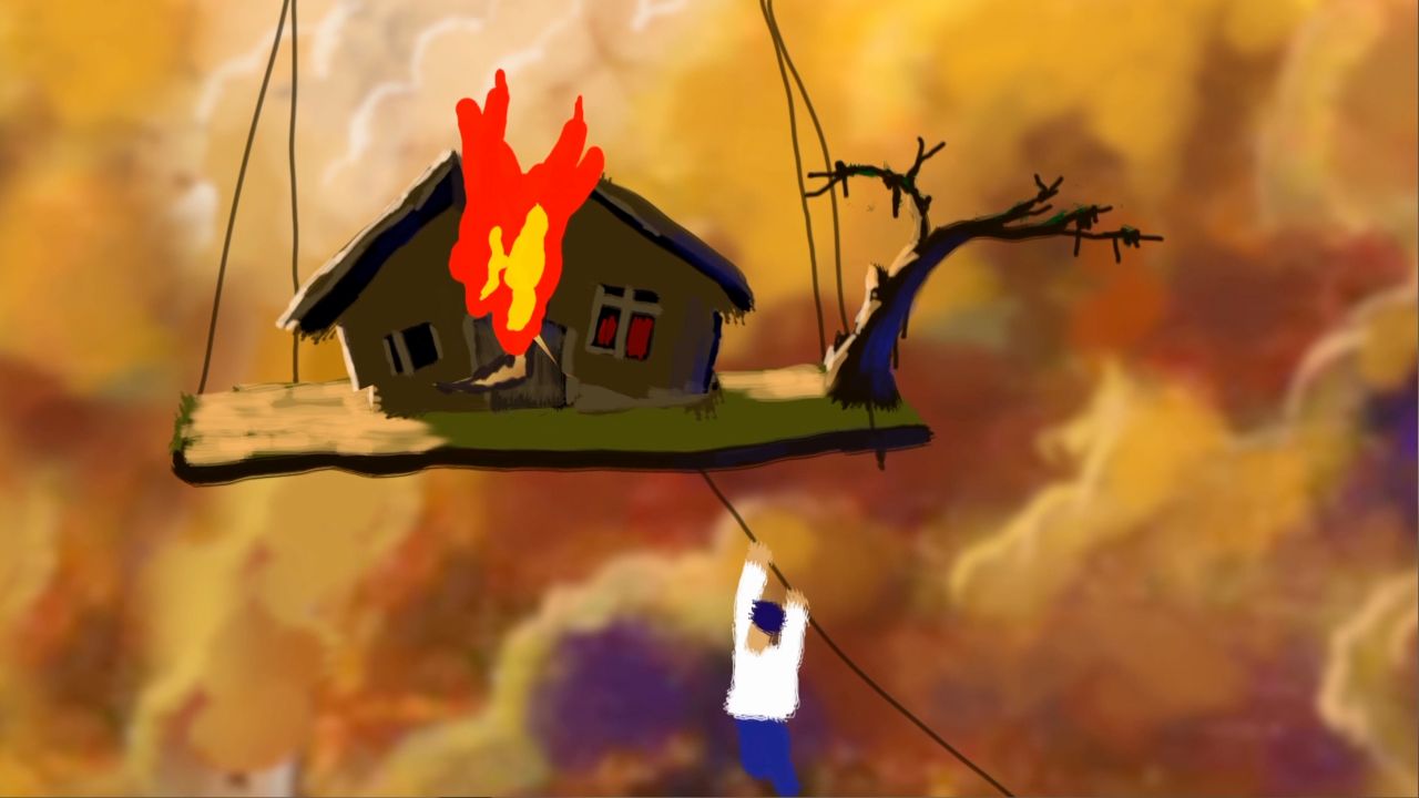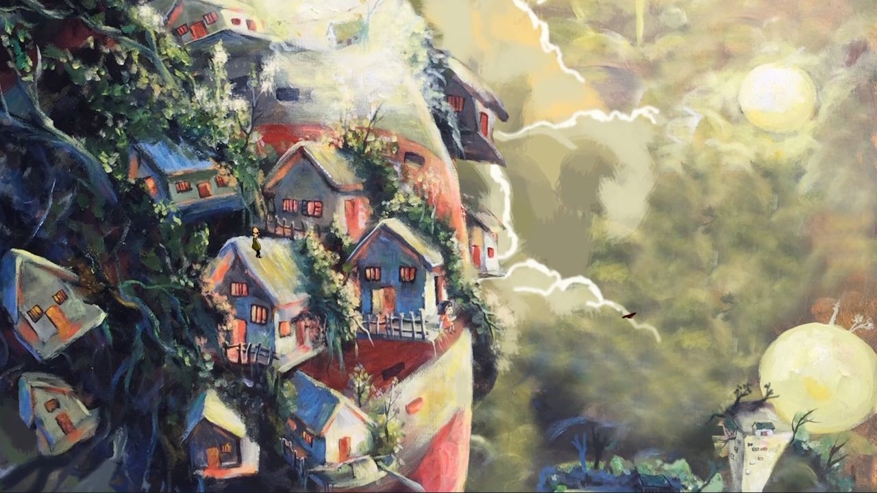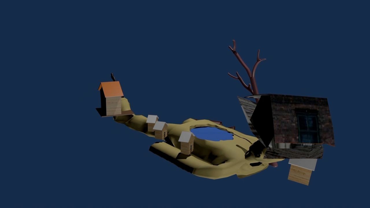 陳鏹:第一處是建築物從手繪變成 3D,這是開篇部分,這裡我是想給觀眾一個提示,影片視覺效果會有很多不同的變化。再來,則是出現在父親身體變成墜落的小鎮後有一個全貌的展示,這邊想加強幻象的真實感,並且在作品節奏上給出一個小驚喜。