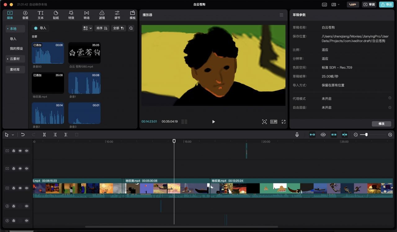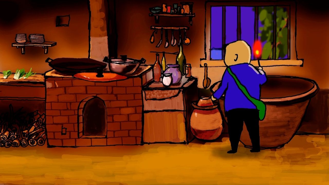 陳鏹:片中 2D 是用 Photoshop 的時間軸功能,3D 則是用 Blender,剪輯則用了剪映專業版,中途還用 iPad 下載了 FlipaClip 來製作動畫,有一部作品《四十歲的孩子》就是用這個軟體完成的。《白雲蒼狗》製作過程中最耗時的還是繪製工作,這個過程我都是孤獨地把自己關在狹小的工作室裡埋頭苦幹,很長一段時間謝絕無效社交。當最後一個鏡頭完成後,我也不會馬上去剪輯,而是先著手音樂,這也是一個放鬆的過程,剪輯時我需要很輕鬆的狀態,才能在良好狀態下調動備好的素材。在配音的時候,我都會先把所有的對白自己按照我想要的方式配一遍,接著讓配音演員按照我的語氣去完成,這樣他們能很直接地瞭解我的意圖。片中語言大部分是用四川話,因為它有一種天然的幽默感。