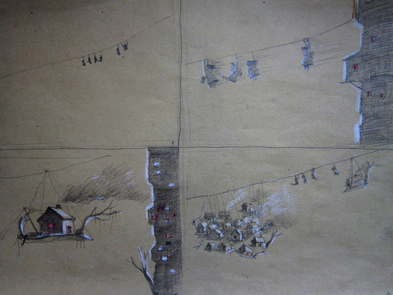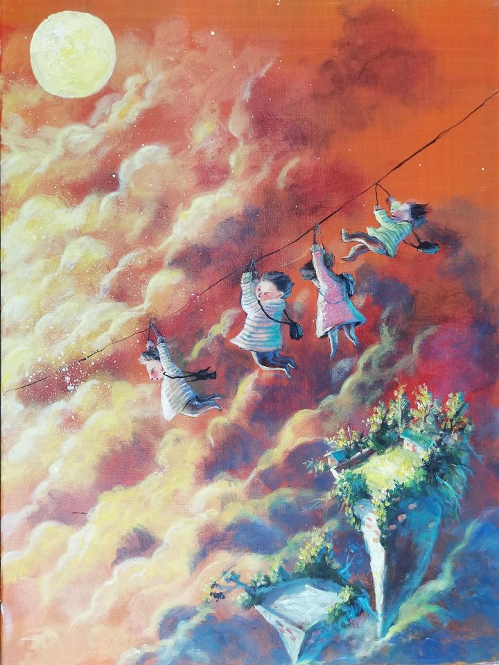 陳鏹:2009 年蒲粵梅開始創作《懸城》系列油畫作品,靈感來自於當年我們購買的一套房子,那套小房子在 29 樓,經常從上面往下看都是雲裡霧裡的,那種感覺被她延伸到了畫面中,我在閱讀她的這系列油畫作品的時候,隱隱約約感受到了一些故事。其實畫畫的人都有同樣的想法,就是要把自己的作品做成動畫,於是我做了第一部動畫故事片《懸城》,當《懸城》完成後,我順勢又編了《白雲蒼狗》。