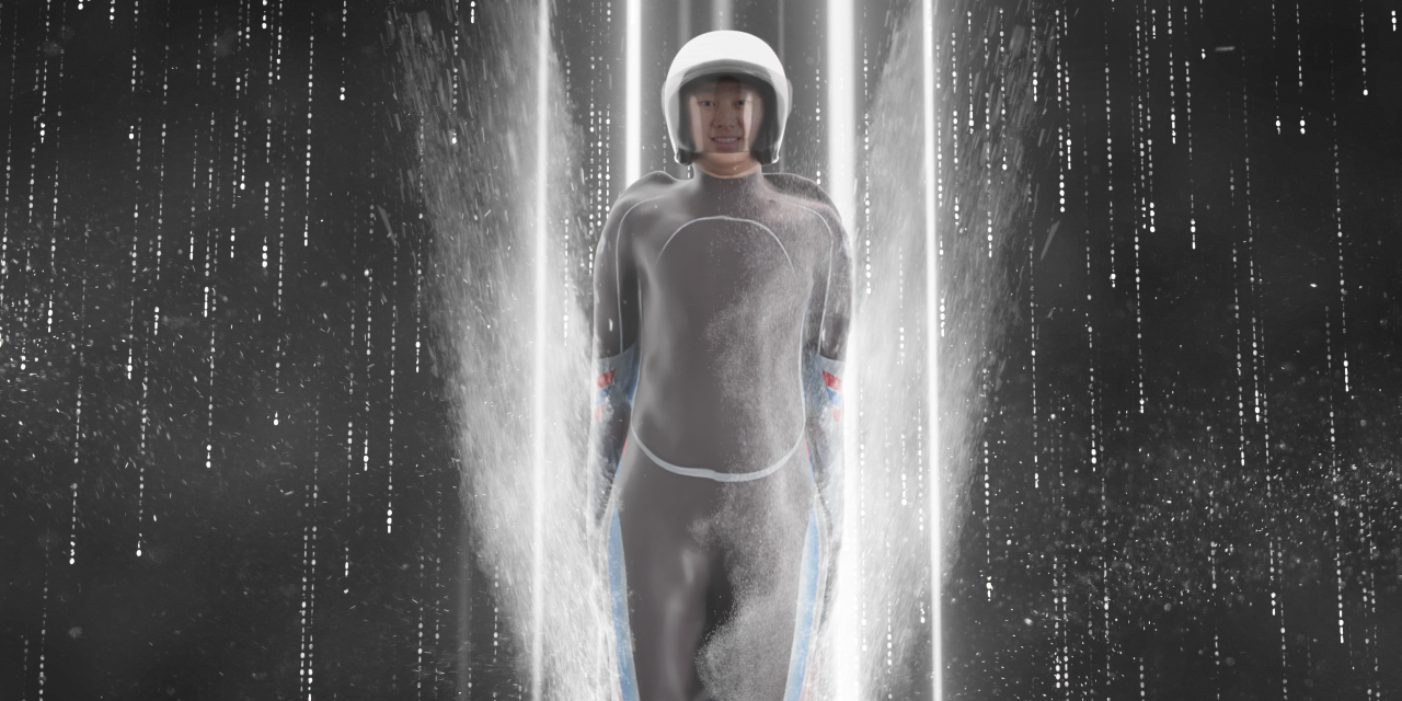 任偉強:有幾項運動後製的比例更高,像是游泳首當要件如何還原運動員在水中的姿態,導演有嘗試給予運動員腹部支撐,在半空中模擬滑水感,但是動作不如預期,於是調整成讓運動員以站姿,身體前傾擺出游泳的動作,再透過後製,以水花遮蔽腰部以下的姿態。另外,拍攝雪橇運動也是需要大量的後製。因為 4DViews 攝影棚無法設置成一個斜坡,讓運動員以雪橇滑下來,所以只有讓運動員去想像高處滑落的動作,最後,通過後期製作,加入動態雪花的特效,來營造出真實滑雪的感覺。
