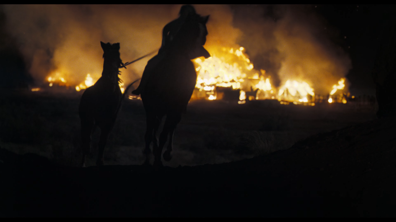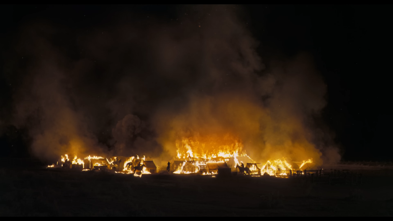 《地平線》中最令人坐立不安的一幕發生在鎮上舞會當晚,阿帕契人毫無預警地來到鎮上縱火報復,居民們驚惶失措之餘試圖回擊。導演凱文希望創造啟示錄般的焰火,雨隨著餘燼一起落下。然而拍攝當天風勢相當大,無法捕捉到有足夠的煙霧和火花的畫面。Ingenuity Studios 所提供的特效擴大了這場屠殺的規模和危險性,他們量身打造添加了大量火舌與煙霧,以及舉手投足都十分自然的 CG 群眾,將戲劇張力拉滿。這場夜戲中的火光幾乎都是特效製成的,團隊在拍攝現場以燈光器材模擬河流水面映照的火光,後續也使用了數位替身。