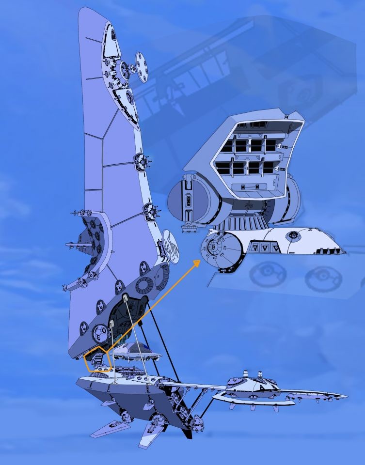 邱立偉:相比「鐵扇建設」比較雄偉、有力的場景設計,涅槃企業以流線型為主,追求簡潔俐落,外觀以「鳥」為主,從 logo、總部外觀到八戒乘坐的飛船都是不同鳥類的形狀。例如八戒乘坐的飛船的一隻小白文鳥。以「鳥」為發想的主因,暗喻著涅槃企業對於「新世界」的追求,設計上比較有靈性。